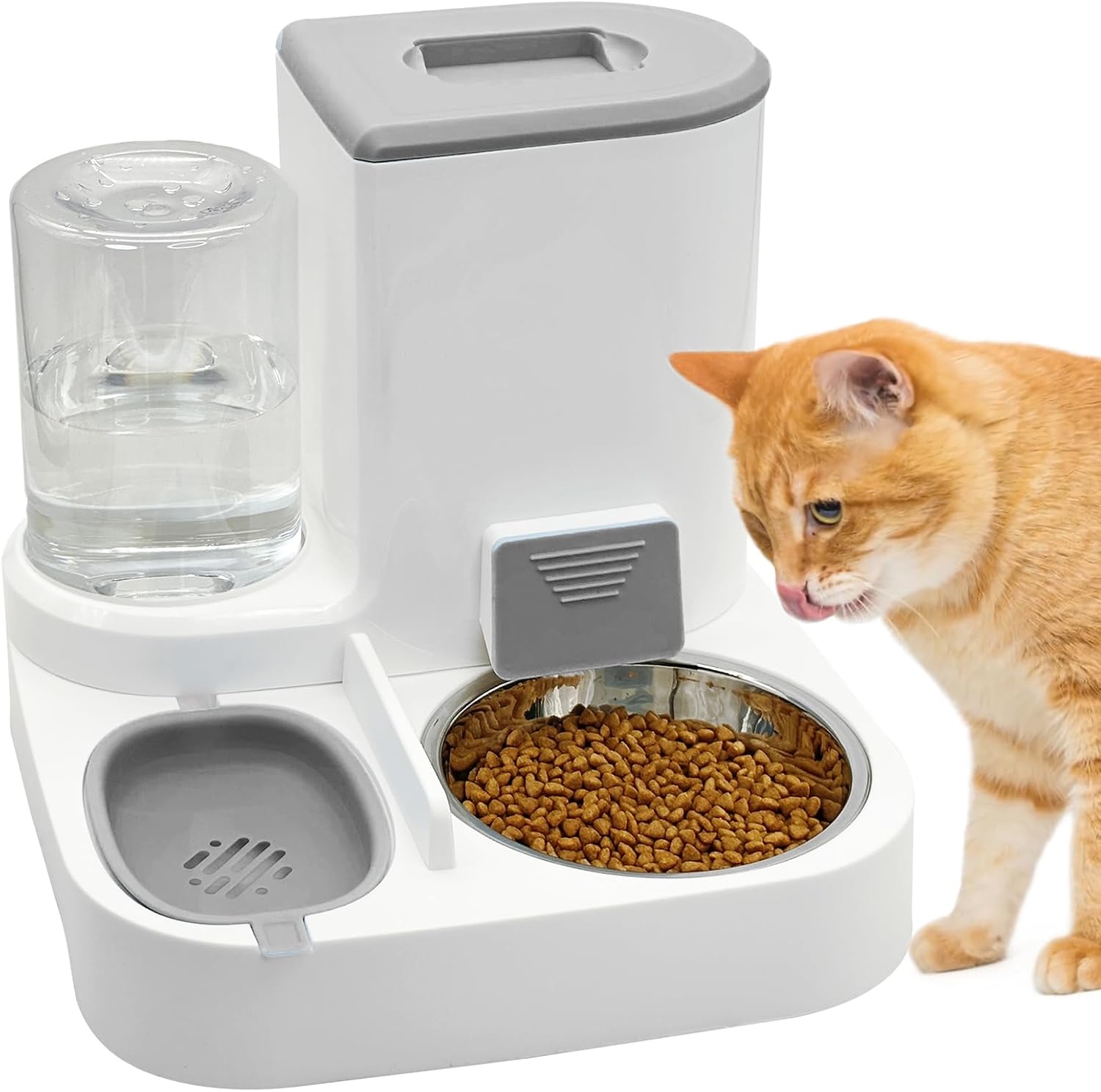 🐱【Large Capacity】: Cat food dispenser can hold 1/2 gallon of dry cat food and 1/4 gallon of water, the water bottle uses the gravity siphon principle and the water stops automatically when it reaches a predetermined location. Feeder spout 45 ° tilt, 2.5 inches wide smooth not stuck food.