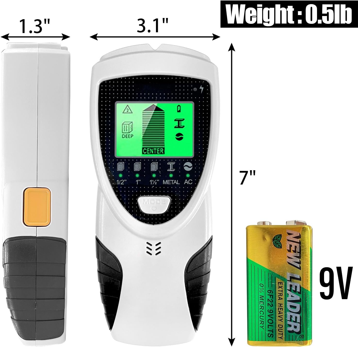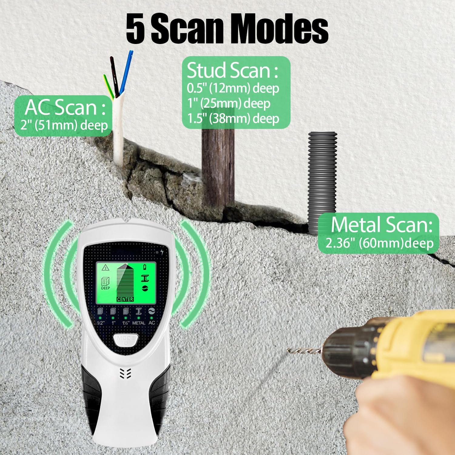 This stud finder features 5 Modes: Stud Modes with 3 depths - 1/2", 1" & 1-1/2"; Metal Mode with 2-3/8" scan depth; and AC Mode detects live unshielded AC wires up to 2".
