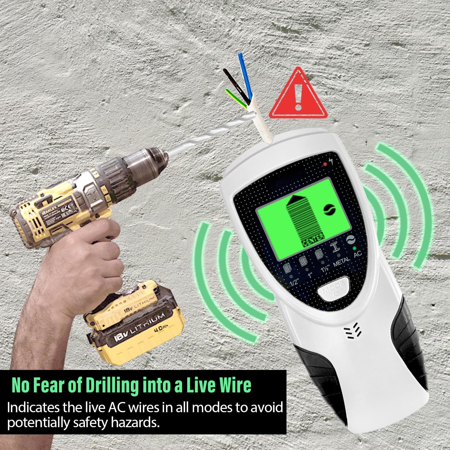Live AC wire detection works in all modes to avoid safety hazards, when unshielded wires are detected, AC wire warning icon will appear on the screen and indicator above the screen will turn red.