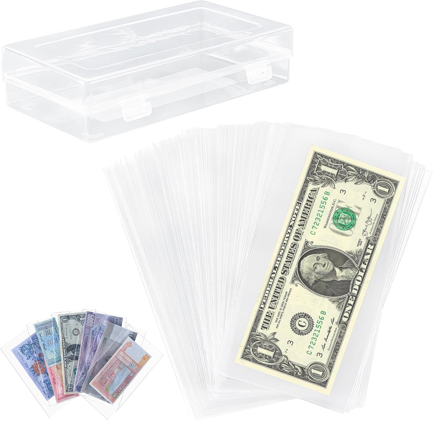 Uncle Paul 200 Pieces Dollar Bill Holder with Storage Box, Clear Paper Money Sleeves Currency Sleeves and Holder Money Collection Sleeves Bank Note Sleeves for Collector PN02