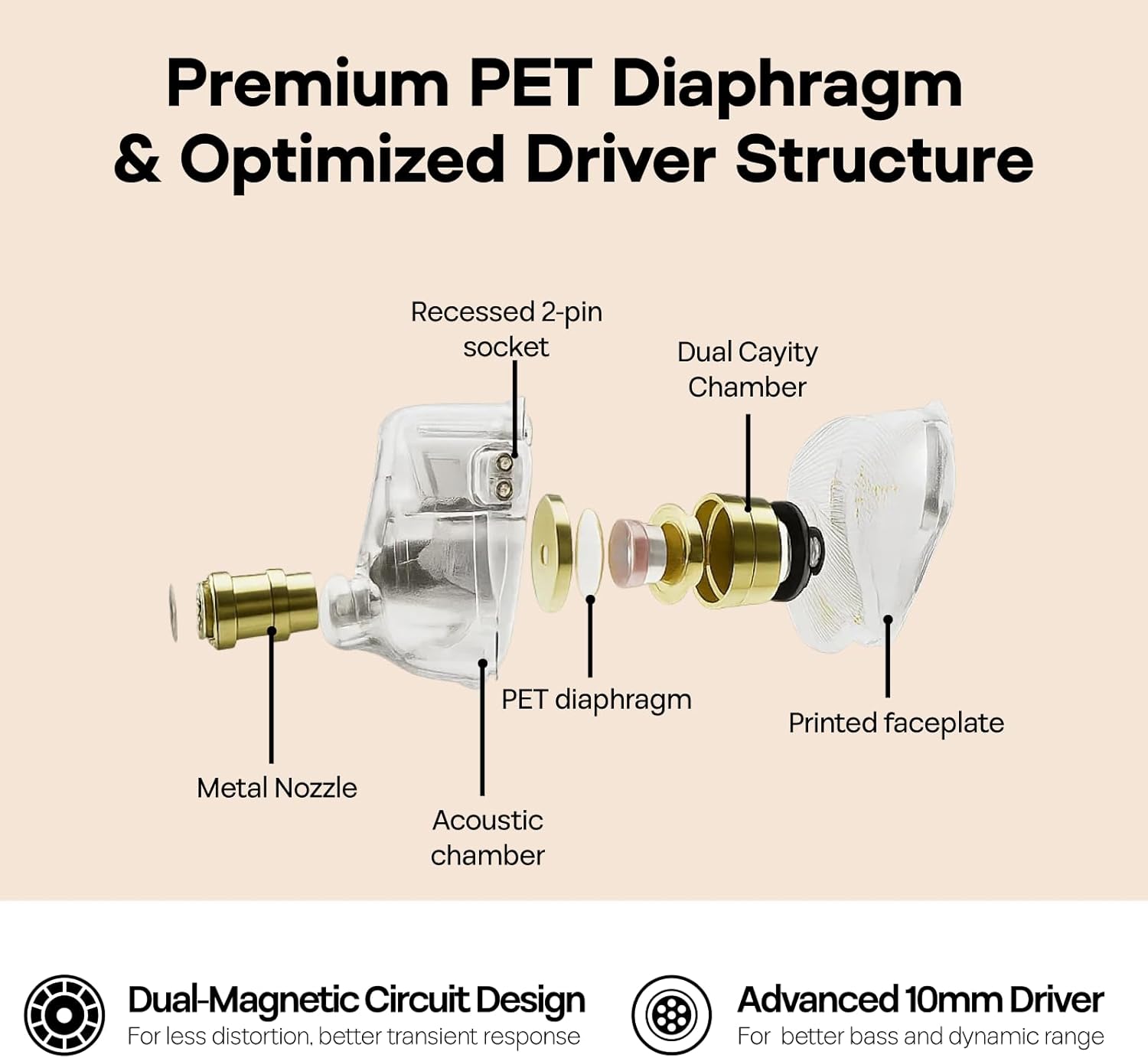 【Driver Dinámico de 10mm, Rendimiento Notable】Equipado con un driver dinámico único de 10mm, Wan’er S.G finalmente se lanzó después de 5 ajustes de driver durante el desarrollo de afinación. Después de todos los ajustes realizados, el rendimiento general es satisfactorio con una presentación sonora suave, completa y limpia. Este auricular es un nuevo intento de la marca para perseguir un sonido musical pero equilibrado con una firma sonora más gruesa y espaciosa.