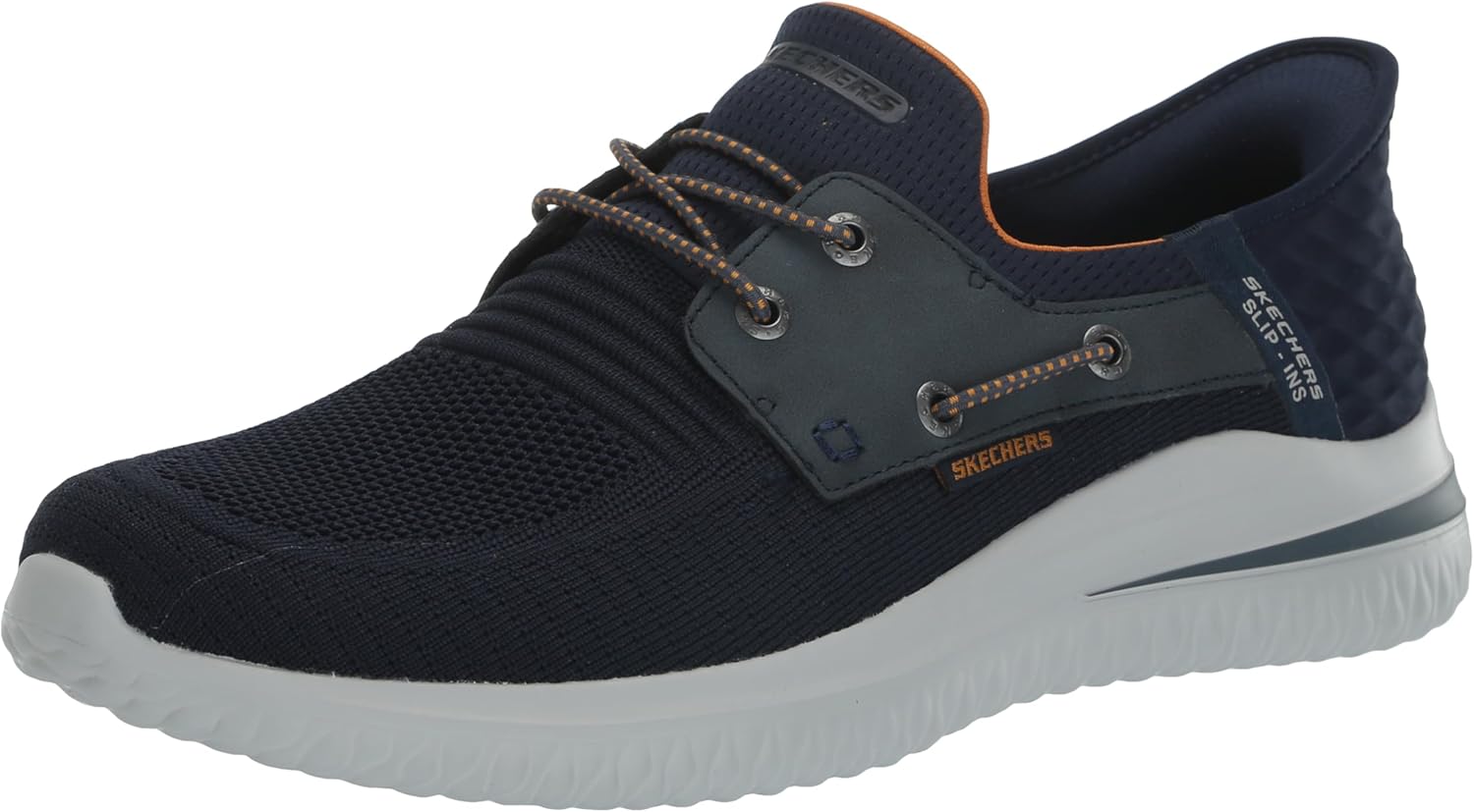 Simply step in and go wearing Skechers Hands Free Slip-ins™: Delson 3.0 - Roth. Designed with our exclusive Heel Pillow™. This Classic Fit style features an engineered knit and synthetic upper with stretch laces, a Skechers Air-Cooled Memory Foam® comfort insole and Goga Mat Arch™ cushioning for added support.