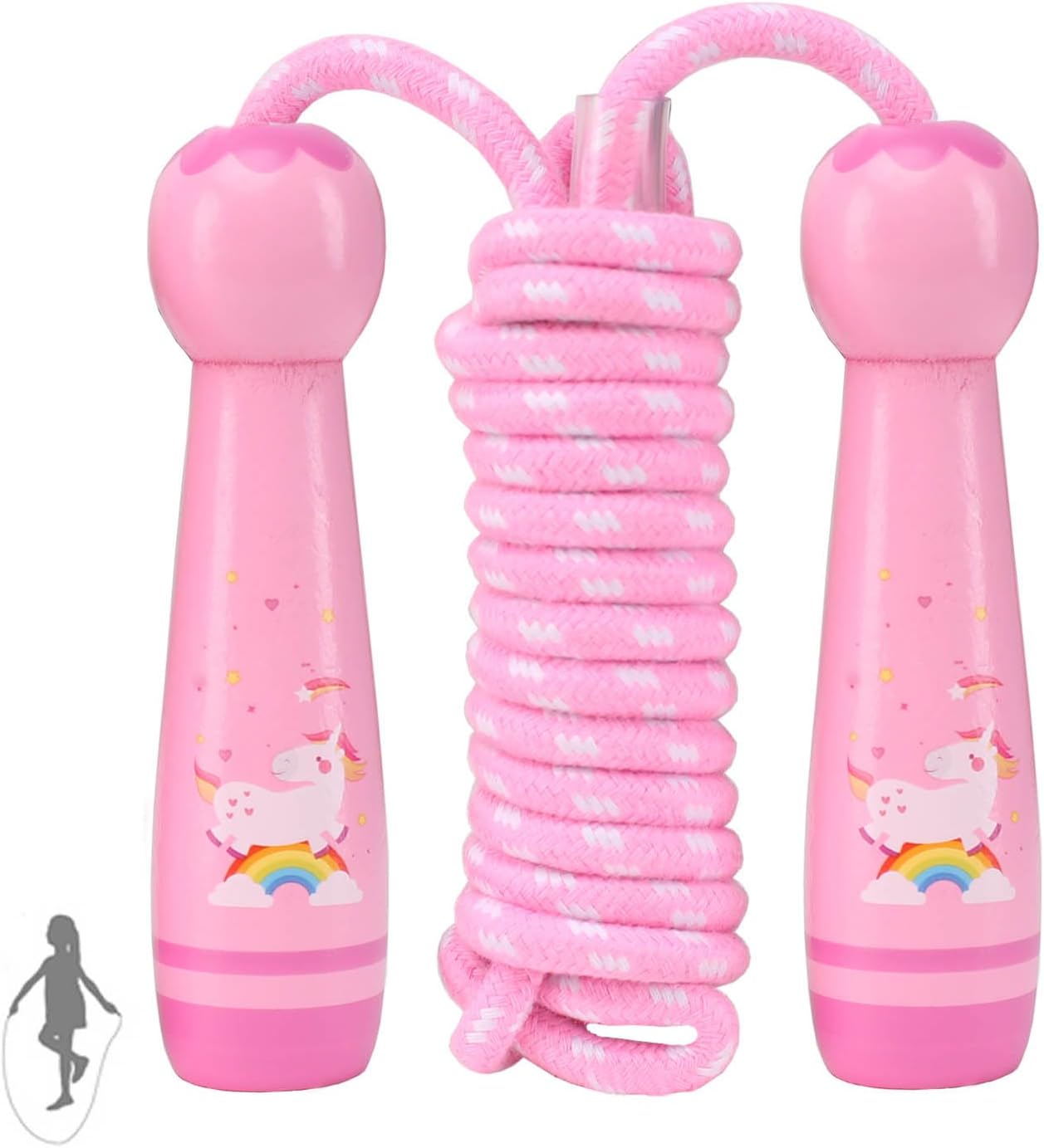 Skipping Rope for Kids Boys Girls, 8.5ft Adjustable Jump Ropes for Children 3 Years+, 2.6m Child Jumping Rope Cute Skip Ropes with Wooden Handle for Exercise Fitness or Gifts. ☀Specification: Material: wooden handle + cotton rope. Size: 2.6 meters/8.5 feet. ☀Features: 1. This skipping rope is the best gift for children's day, birthday and various festivals. 2. The rope is made of high quality cotton, which is soft that will not hurt when hitting the body. 3. Even if your hands are sweaty, the non-slip design of the handle can keep your hands in their original position without worrying about slipping. ☀Package includes: 1 x Children Jump Rope.