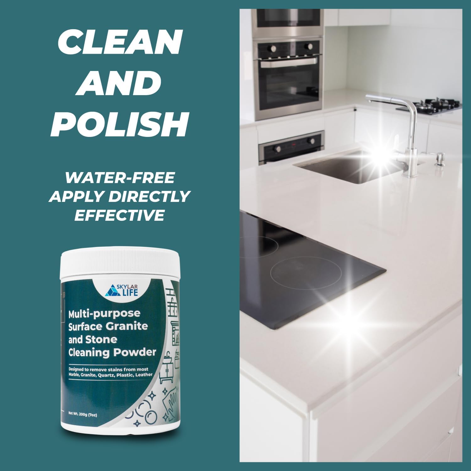 Skylarlife Multi-purpose Surface Stone Cleaning Powder (200g) to remove rust stain, yellowing, oil stains, from most marble, granite, quartz, concrete, countertop and other non-porous surface, remove adhesive spots and stains from boat and plastic and leather