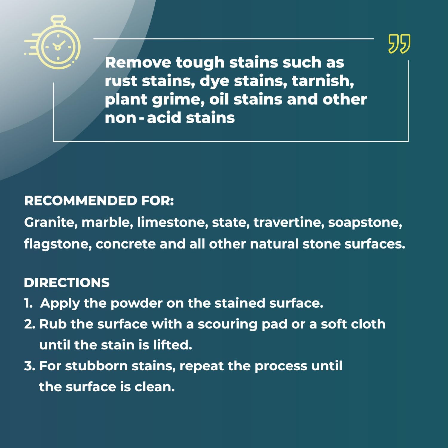 Natural stone stain remover powder. A heavy-duty cleaner for spots, marks and stains.