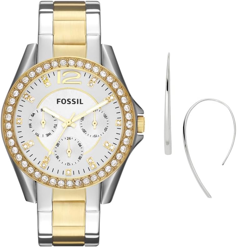 Fossil Women's Riley Quartz Stainless Steel Multifunction Watch + Fossil Women's Silver-Tone Earrings