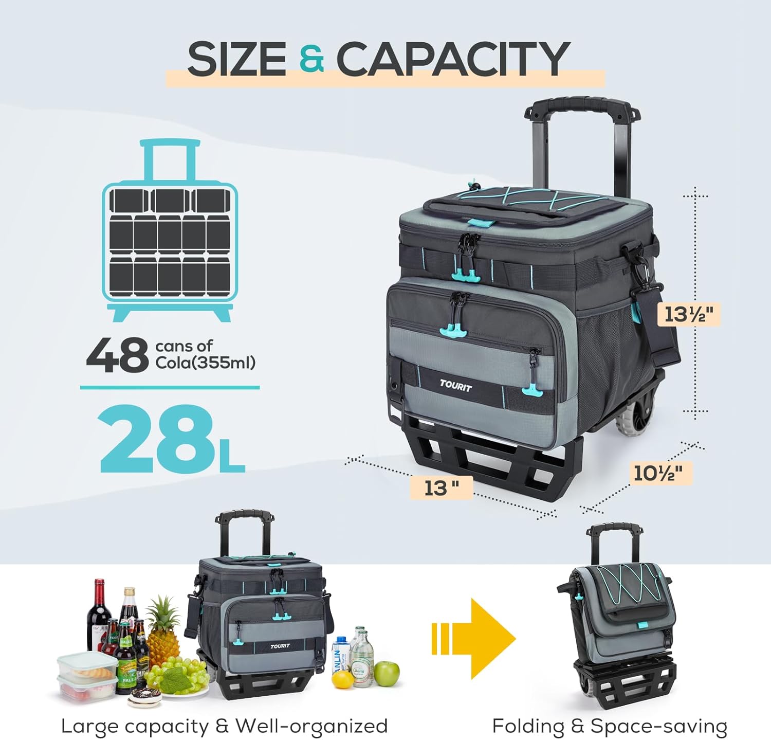 TOURIT Collapsible 48-Can Leak-Proof Insulated Rolling Cooler with All-Terrain Cart, Upgraded Fixtures and New Wheels Suitable for Beach, Picnic, Shopping