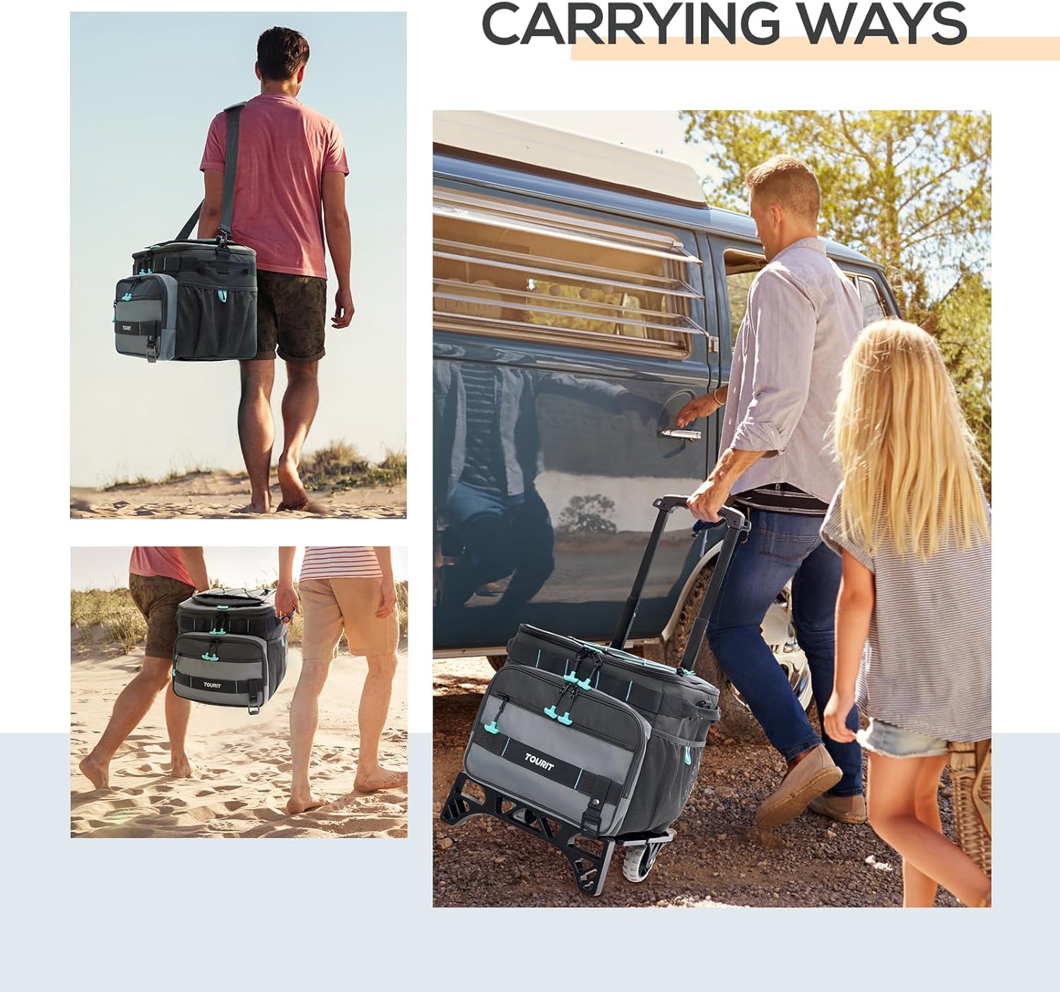 TOURIT 48 Cans Insulated Wheeled Cooler for Hiking Whether you have strong interest in road/ beach trip, picnics or daily hiking, the TOURIT rolling cooler is your best partner for all types of outdoor activities. The stylish design of our insulated bag make it also can be used as a lunch bag or daily pack. 【Product Features】 ■Keep your food cool and safety This cooler bag for hiking choose high-density material to keep your snacks and drinks cool for 12 hours temperature below 15℃(with Freeze Packs). ■Includes a detachable all-terrain cart with an expandable, extra-wide base and all-terrain wheels and a retractable, telescopic hook 'n' go handle; Can hold up to 66 pounds of food and drink items. ■Durable and easy to clean This camping coolers is comfy and versatile which is made of high-density tear resistant fabric with padded, adjustable straps. ■Leak resistant The inner insulation thicken foam and leak-proof liner work together to make sure anti-leaking. 【Multi Compartments】 ■The main storage compartment is large enough to provide roomy capacity for your beers, juice, sandwiches or other food. ■Two front zipper pocket can be used for your chip bags, travel wallet or other small accessories which can be easily access. ■Cooler features an adjustable Backsaver Shoulder Strap with shoulder pad for comfortable travel and exterior material that is tough as well as water- and stain-repellent. ■ 1 beer opener on the strap for your easily use. With this picnic rolling cooler, you can spend the idyllic day with your family, enjoying the drinking at the beach or on the boat.