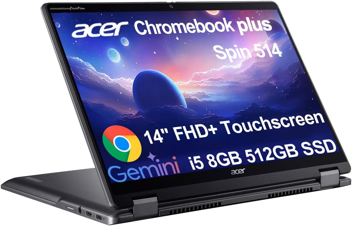 Acer Chromebook Plus Spin 514 2-in-1 Touchscreen Laptop (14" FHD+, Intel Core i5-1334U, 8GB DDR5, 512GB SSD) For Business, Home, Students, Backlit KB, 1080p Webcam, Wi-Fi 6E, Chrome OS w/ Google AI