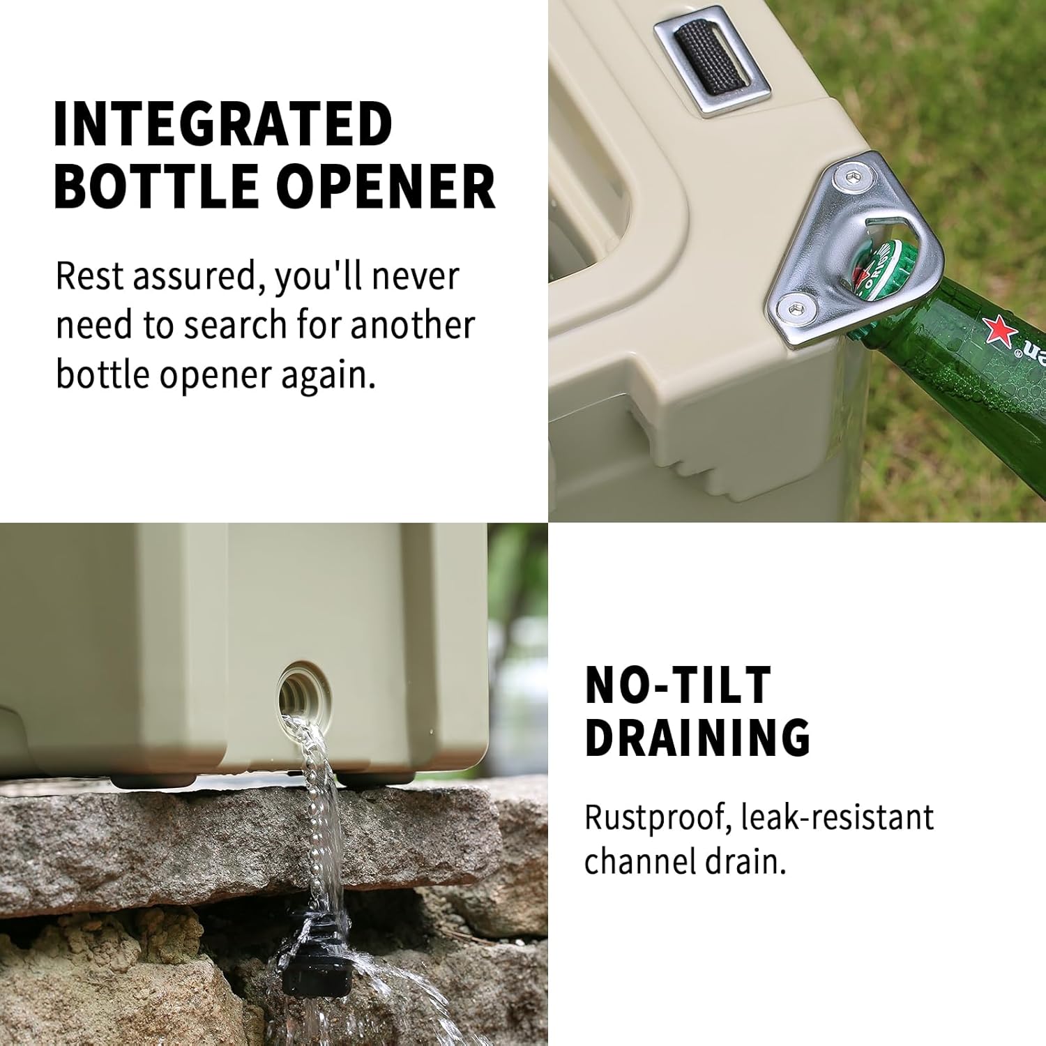 QUALITY MATERIALS: Crafted with seamless LLDPE using rotomolding technology, our coolers feature UV-resistant exteriors and food-safe interiors. The impact-resistant, one-piece design withstands extreme outdoor abuse while maintaining structural integrity - no cracks, leaks, or warping under 310+ lbs weight capacity.