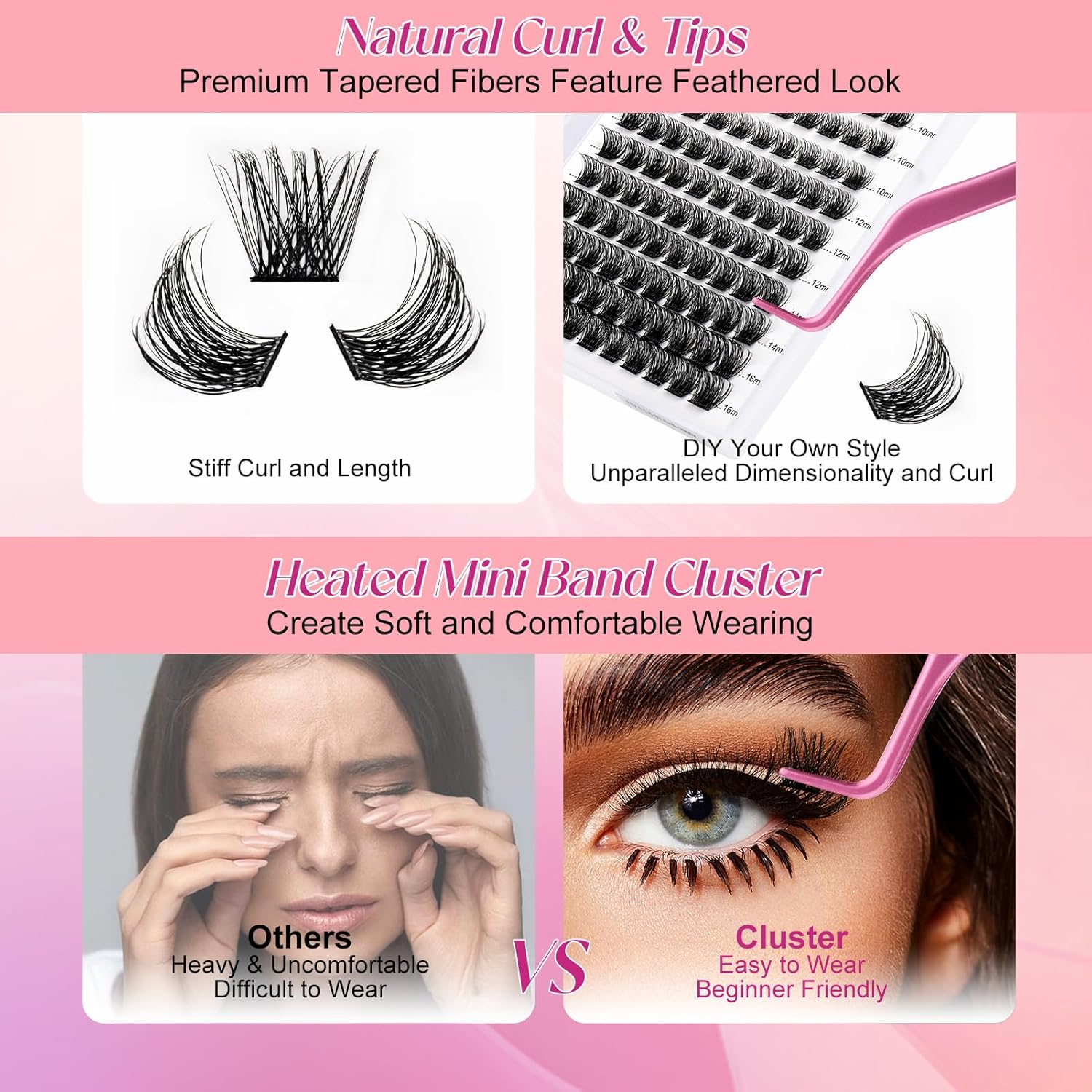 Suitable to Wear: Use a tweezer to pinch the band of lash clusters and apply them below natural lashes. You can barely feel the lash cluster extensions. The bottom of the lash clusters is flat and hardly noticeable. The cluster lashes band part will not stab your eyelid area when you blink. Bring you a perfect experience during lash application.