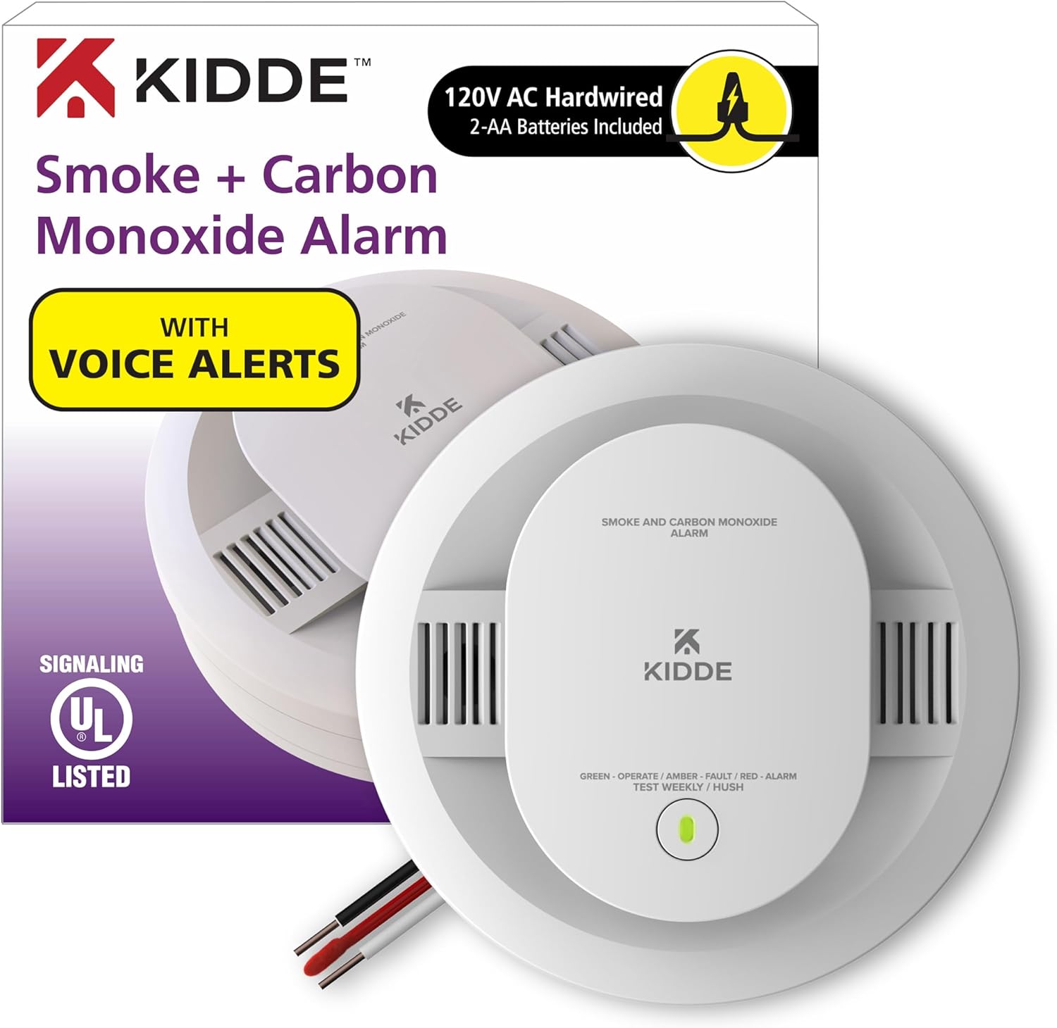 The Kidde Hardwired Smoke & Carbon Monoxide Detector, AA Battery Backup, Voice Alerts, Interconnectable, LED Indicators, model 900-CUAR-V, is an alarm combo that detects smoke, fire, & carbon monoxide gas, using a single alarm. Operating through your home's wiring (120V AC power), while 2-AA batteries (included) provide battery backup during the event of a power failure, the Kidde Smoke and Carbon Monoxide Alarm is equipped with self-testing components that are always checking the unit to ensure the device is operating as expected*. Photoelectric sensing technology that senses visible fire particles (associated with smoldering fires), while an electrochemical sensor detects carbon monoxide. When a smoke, fire, or carbon monoxide event occurs, the Kidde fire alarm warns with an 85-decibel alarm sound & flashing red LEDs, and voice alerts announcing, "Fire! Fire!". For carbon monoxide detection, the alarm will sound with the announcement "Warning! Carbon Monoxide!". When the smoke alarm is at the end of its life span, the detector will announce, "Replace Alarm!". Three LED warning lights provide status of the alarm: a green status alerts to the alarm operating properly, amber alerts to faulty operation or connection, and red alerts to smoke, fire, or carbon monoxide. The Smart-Hush button silences the unit for approximately 8 minutes, which is helpful when this smoke detector carbon monoxide detector combo sounds from things like routine cooking or shower steam. Install a carbon monoxide smoke detector combo on every level of your home and near bedrooms to help keep your family safe. UL Certified with a 10-year limited manufacturer's warranty. *Self-testing is not a substitute for a manual push test of the alarm. Perform a button test once per week to verify proper alarm operation. **Alarms only connect with select Kidde alarms that have hardwired AC interconnect capability (see User Guide).