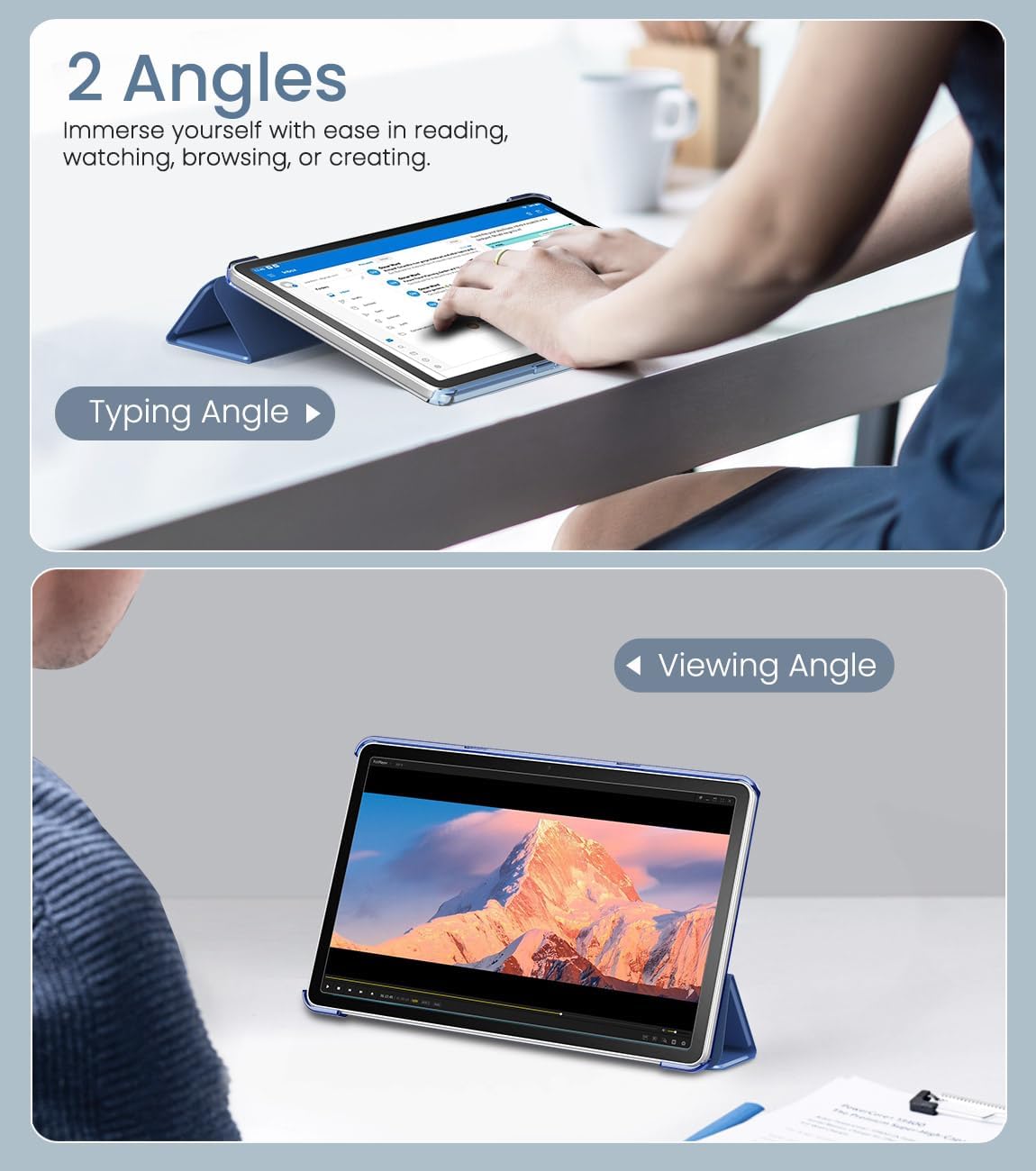 Ángulos Duales: El soporte ajustable ofrece una posición de visualización de video de 60° y una posición de escritura de 30°, satisfaciendo tus necesidades en tu tableta Kindle Fire 11. Libera tus manos para otros entretenimientos.
