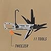 11-IN-1 MULTI-TOOL: Features plain edge blade, tent stake puller, saw, scissors, ferro rod strike, awl, file, ruler, bottle opener, tweezer, and carabiner carry