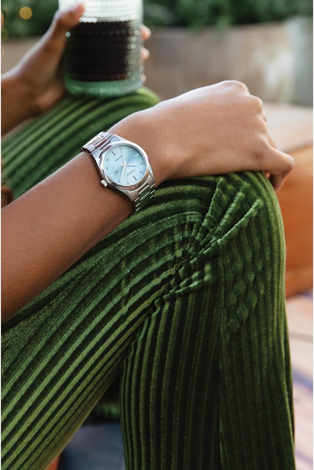When sporty style meets luxury, you get this latest stunner from Citizen. Joining ready-for-anything wearability with feminine elegance, this time-and-date timepiece is the ultimate day-to-evening watch to wear. The silver-tone stainless steel case measures 33mm in diameter and is presented on a silver-tone, 3-link stainless steel bracelet for a sleek, versatile wear on the wrist. The radiant blue dial is characterized by its highly legible style and diamond accents, elevating the sporty wearer one step further. A water resistance up to 100 meters helps the dynamic watch maintain a host of functionality without compromising its alluring appearance. Powered by Citizen’s proprietary Eco-Drive technology to provide light-powered vitality continuously and sustainably without ever needing a battery. Caliber E013.