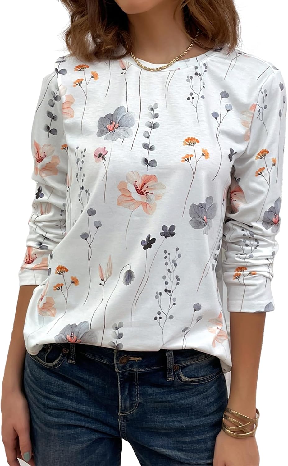 JUSTFASHIONNOW Womens Long Sleeve Tops Casual Shirts for Women Summer Flower Printed T Shirt Crewneck Floral Tee