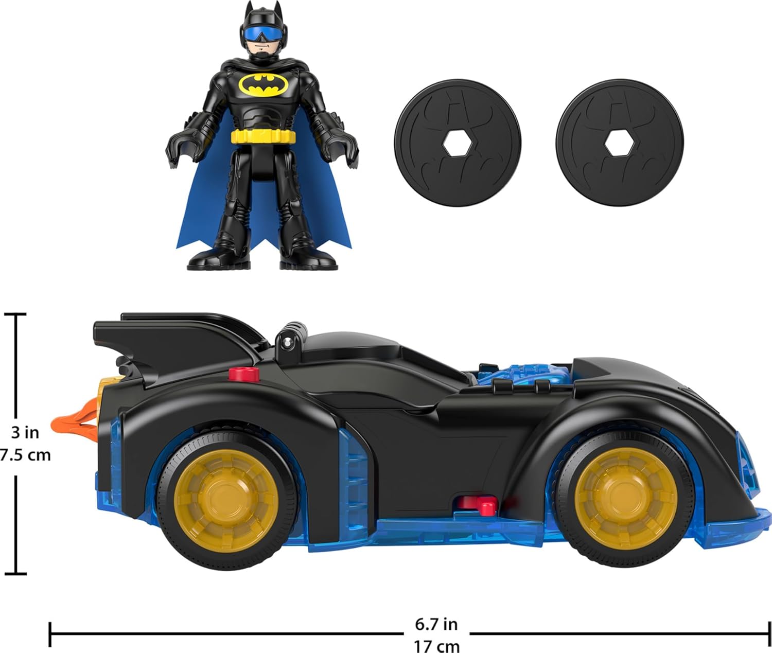 Includes Batmobile, poseable Batman figure and 2 projectile disks