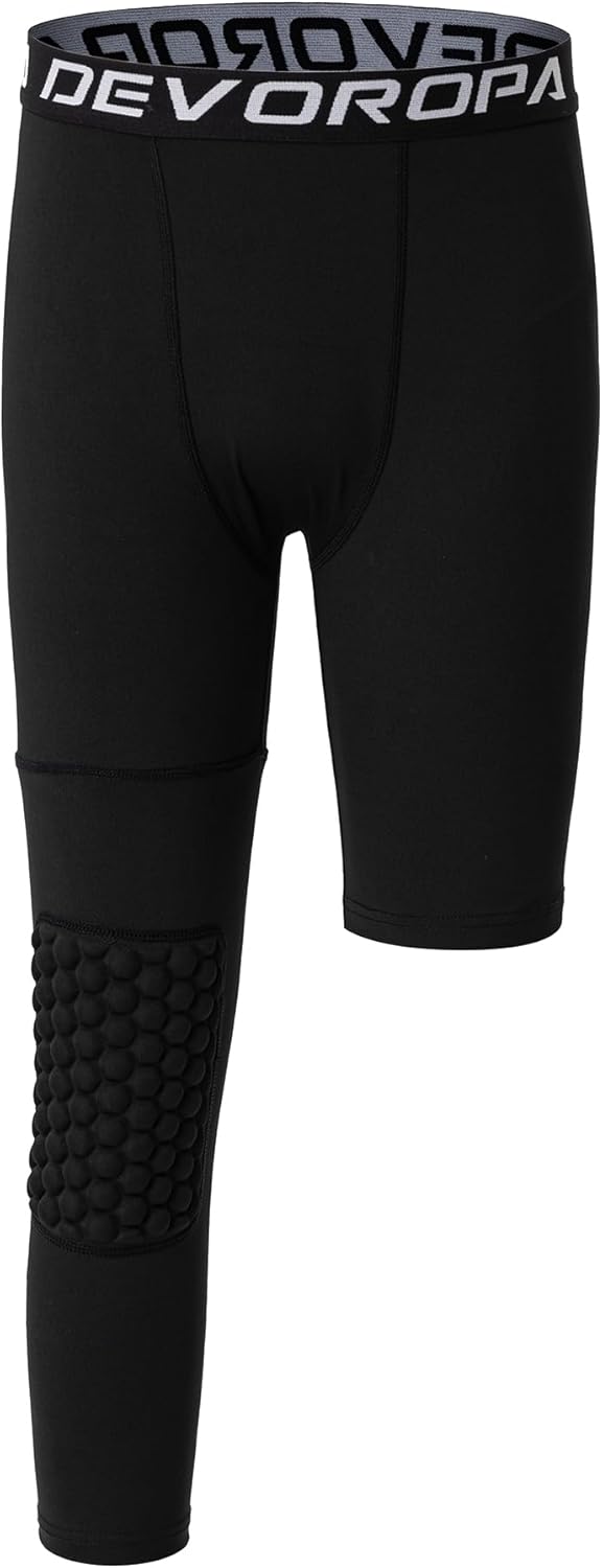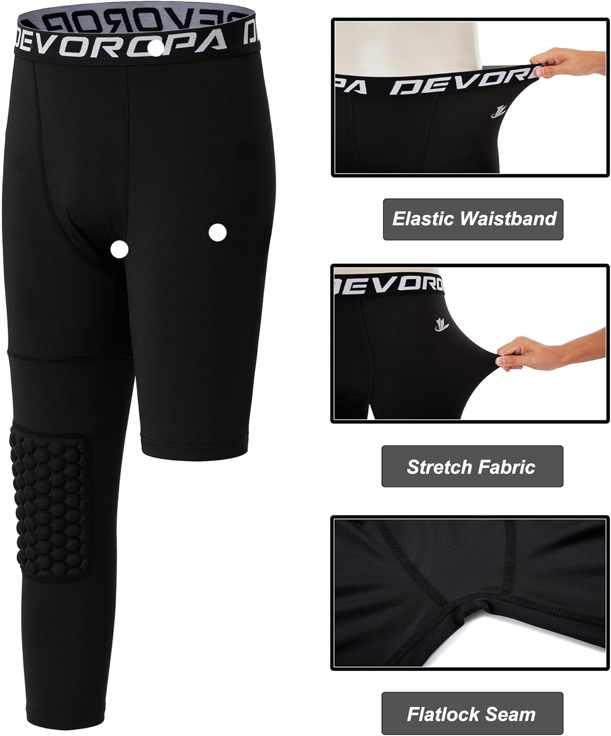 DEVOROPA Youth Boys' Compression Pants with Knee Pads 3/4 Basketball Athletic Tights Quick Dry Sports Workout Leggings