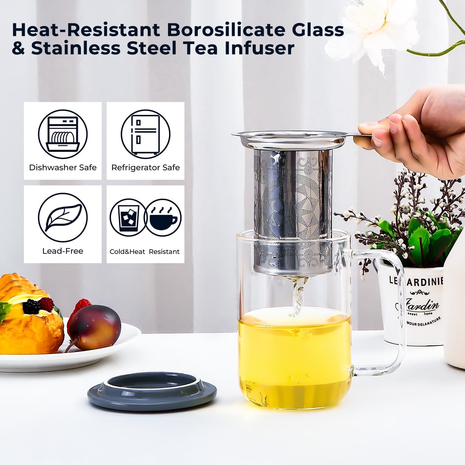STYLISH AND VERSATILE DESIGN - The glass tea cup with infuser and lid boasts a sleek and modern design that complements any setting. Its easy-to-use structure with a comfortable grip and secure lid makes it perfect for daily use or as a gift for tea lovers. Elevate your tea-drinking experience in any occasion