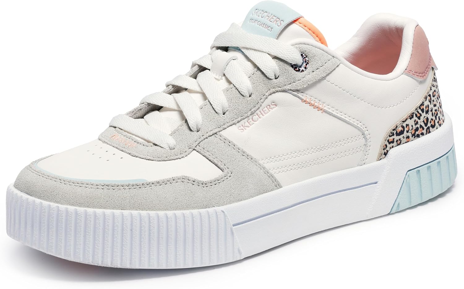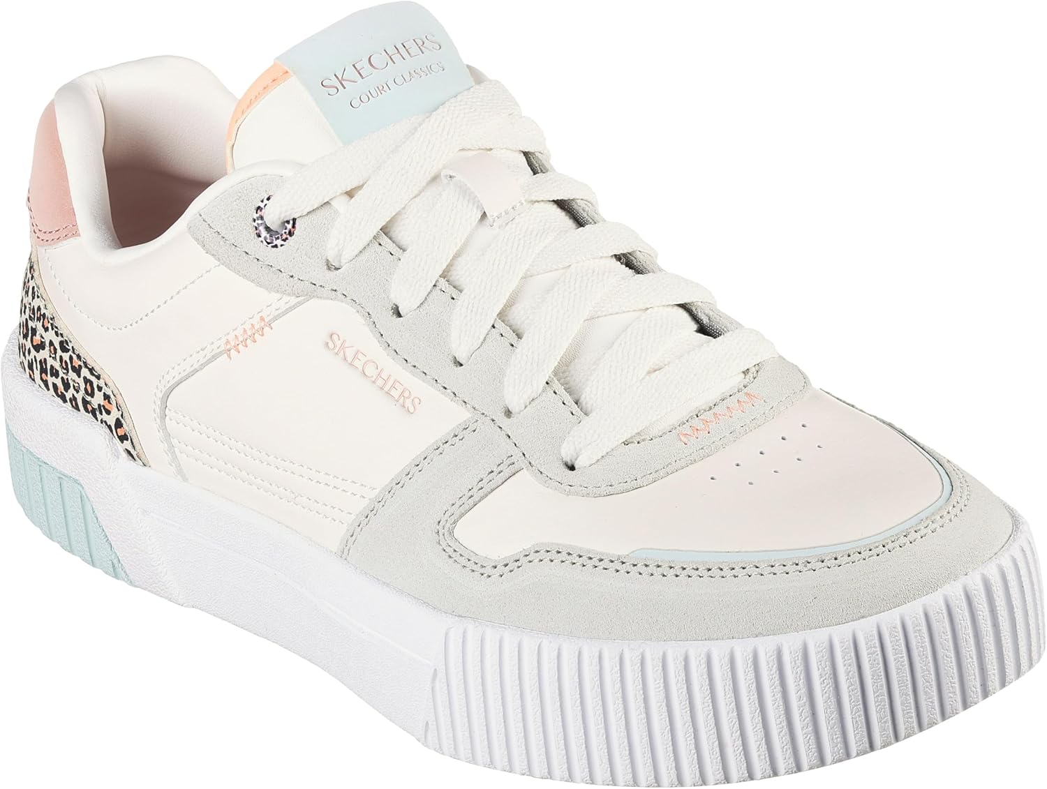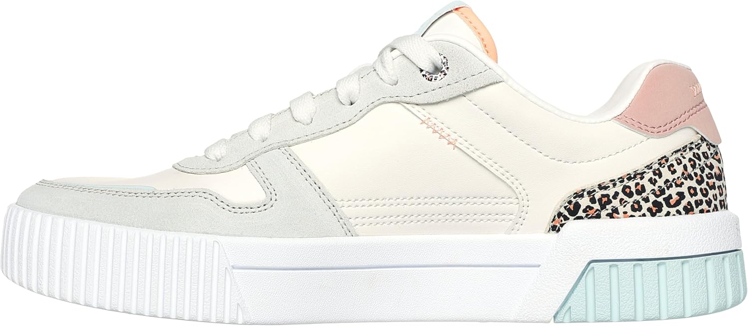 Enjoy purrrfectly styled court comfort wearing Skechers Jade - Feline Instinct. This low-top lace-up features a duraleather upper with color-blocked and leopard print genuine suede overlays, a vulcanized midsole, and a Skechers Air-Cooled Memory Foam cushioned comfort insole.