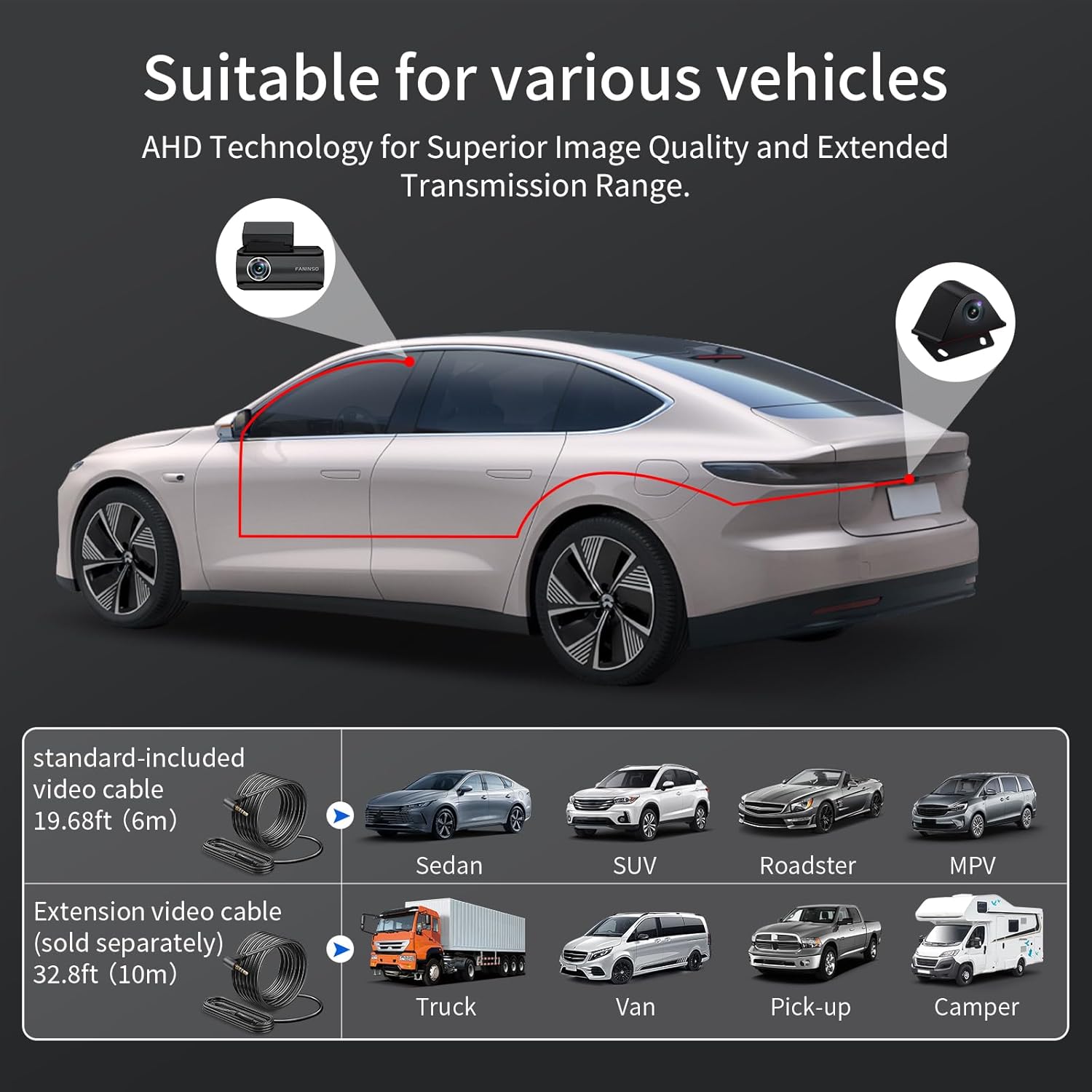 【Superior AHD Technology and Authoritative Certifications】Our camera utilizes AHD technology for reliable transmission of high-definition video over long distances. It is certified by FCC, CE, and RoHS, demonstrating our commitment to quality, safety, and reliability. For larger vehicles, additional video extension cables (ASIN:B0CBJN2Y6P) are available.