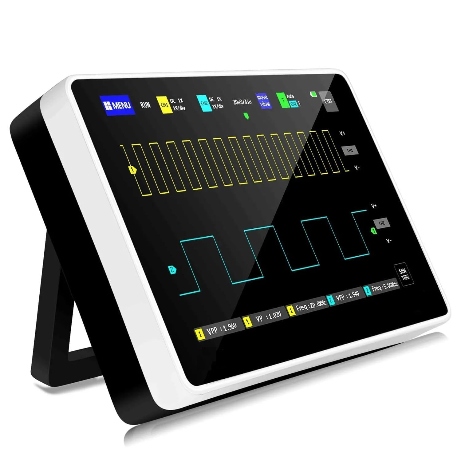 ✅【Large Touchscreen Display】Designed with 7inch clear and responsive touchscreen, portable oscilloscope 1013D provides a more intuitive and user-friendly experience like smartphone. You can easily view and analyze waveforms, measurements, and other graphical data by simply touching and swiping the screen. No major lag at all.