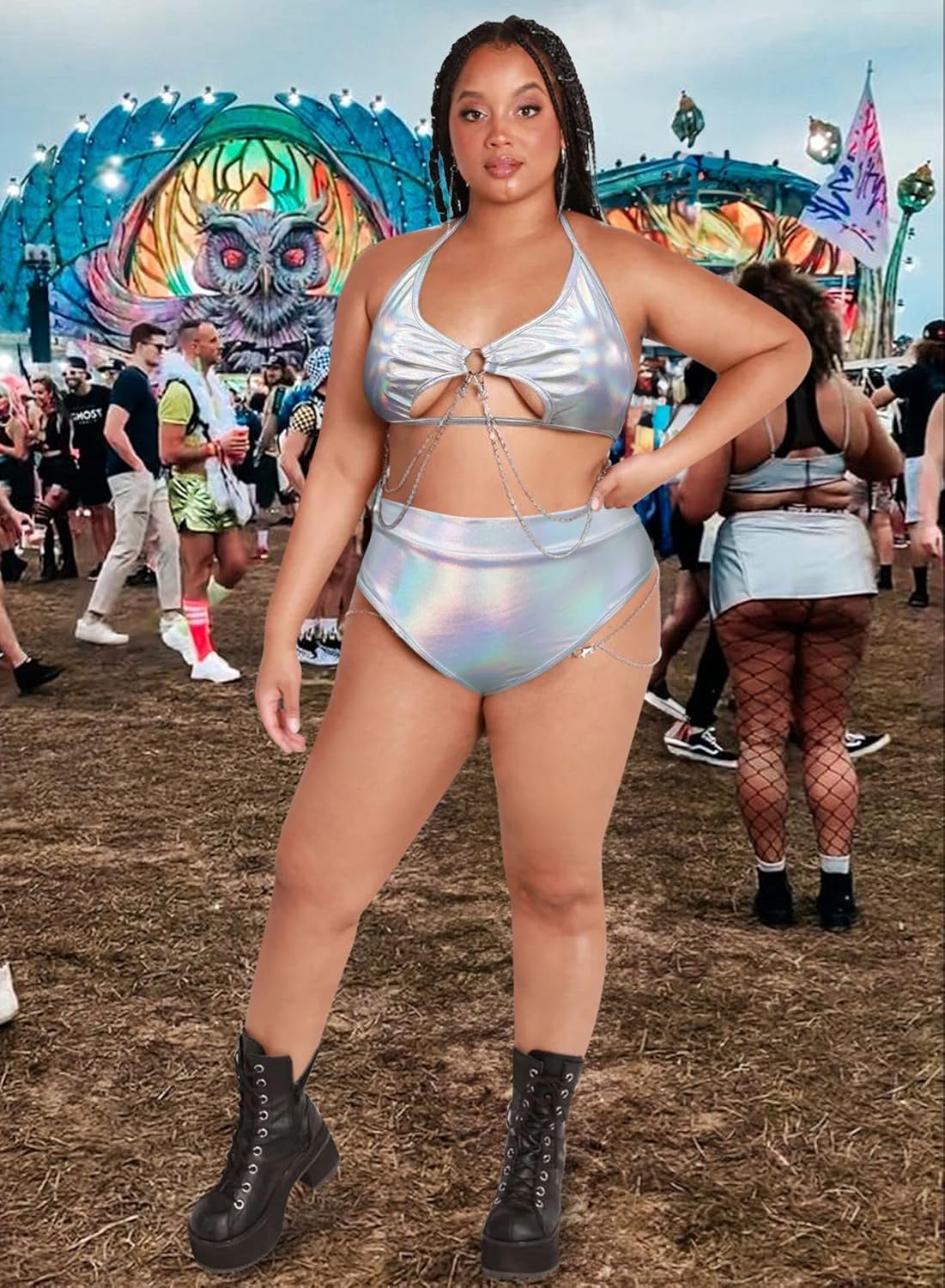 Rave Outfits for Women - Bikini Top Music Festival Underboob Shirt High Cut Bottom Disco Outfit with Silver Chain