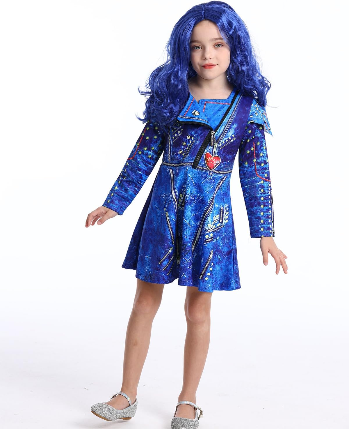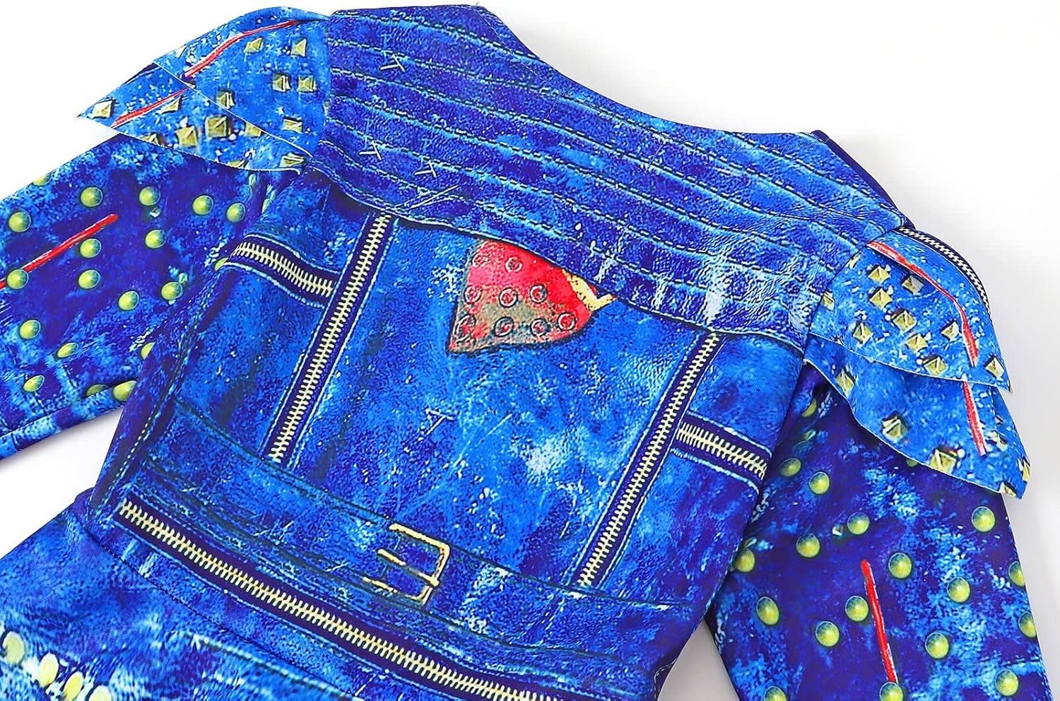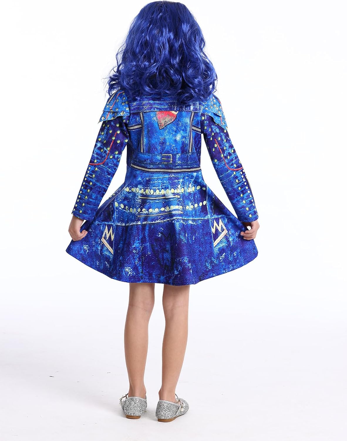 WonderBabe Descendants Evie Costume Halloween Cosplay Evie Dress up Zipper Jacket Long Sleeve Dress Size 9-10t,Blue