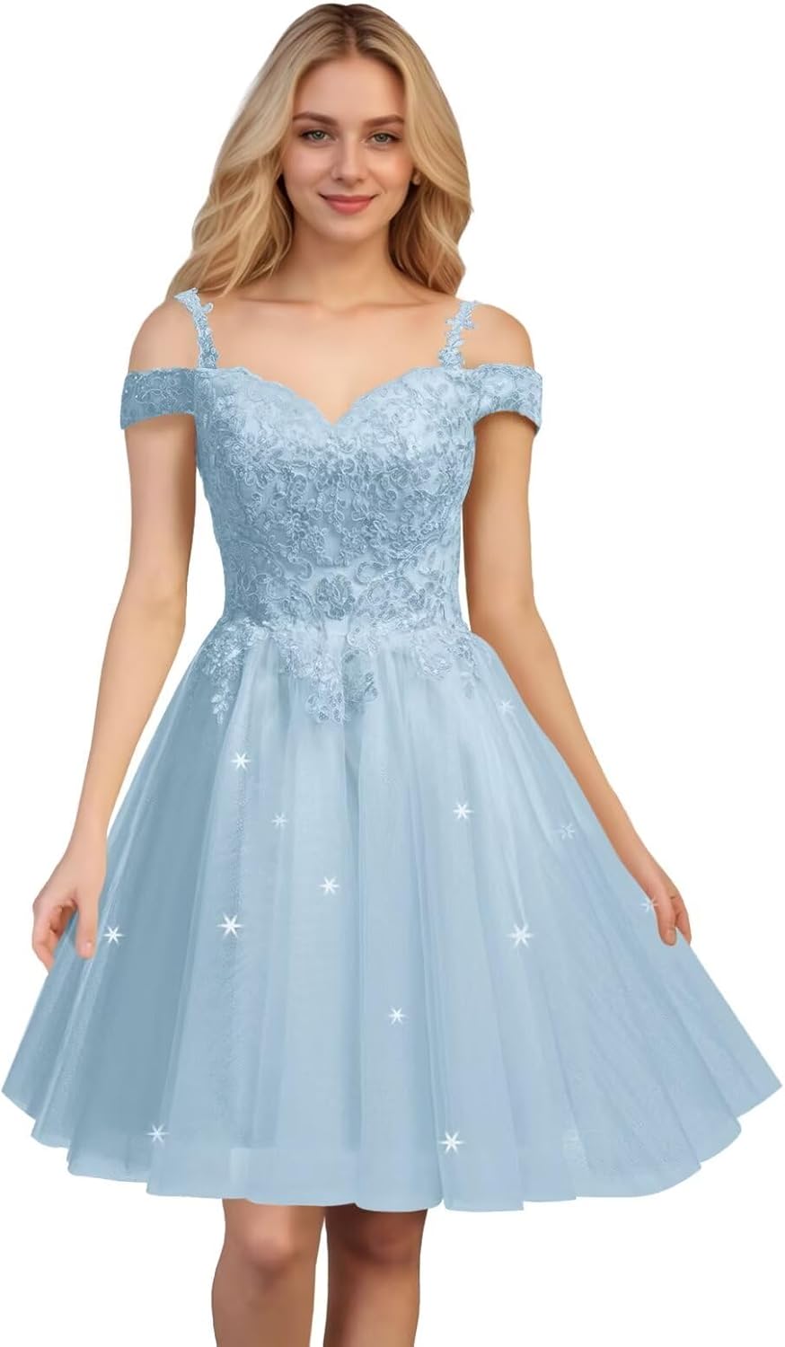 Maxianever Sparkly Homecoming Dresses Lace Appliques Cold Shoulder Short Flower Tulle Prom Party Gowns