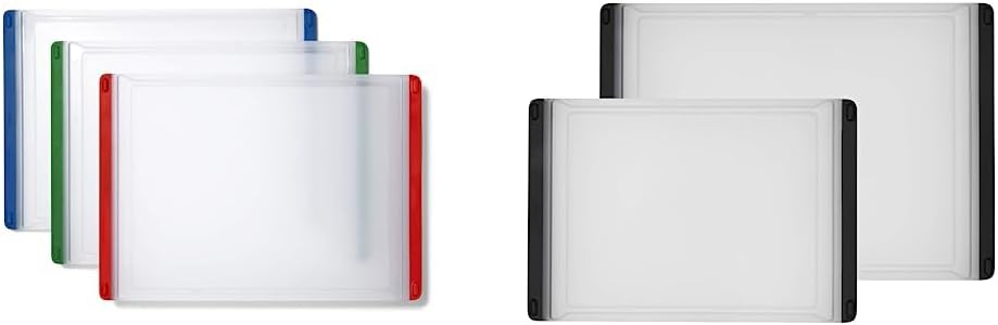 OXO Good Grips 3-Piece Plastic Everyday Cutting Board Set - Red, Green, BlueKiss cross-contamination worries goodbye when you use the OXO 3-Piece Everyday Cutting Board Set for meal prep. Non-porous construction keeps the cutting surface fresh, while color-coded bands keep you organized in the kitchen. Use red for meats, blue for fish, and green for veggies to so always know which one to use for the task at hand. Soft, tapered edges double as handles for comfortable lifting and carrying, while the cutting surface goes easy on your knives. Non-slip feet keep the cutting board in place for safety as you slice. Each 9-in by 12.9-in board features an integrated drip-catcher to keep even the juiciest foods contained. When you're done, pour away excess liquid easily from any corner of the board and pop it in the dishwasher for thorough cleaning and sanitizing. These durable boards are dishwasher safe for everyone who loves cooking more than cleaning up afterward.OXO Good Grips 2-Piece Plastic Cutting Board Set (Pack of 1),ClearStreamline your slicing, dicing and chopping tasks with the OXO 2-Piece Cutting Board Set. Non-porous construction locks out liquids and odors for a fresh cutting surface every time, while clever, double-sided design keeps cross-contamination at bay. Use the grooved side for meats and the smooth side for produce to keep flavors from mingling as you work. Soft, tapered edges double as handles for comfortable lifting and carrying, and the cutting surface goes easy on your knives. Non-slip feet keep the cutting board in place for safety as you slice. The smaller Prep Board is perfect for trimming veggies or slicing cheese, while the Everyday Board is ideal for making meals. Both boards feature an integrated drip-catcher to keep even the juiciest foods contained. When you're done, pour away excess liquid easily from any corner. These durable boards are dishwasher safe for everyone who loves cooking more than cleaning up afterward.