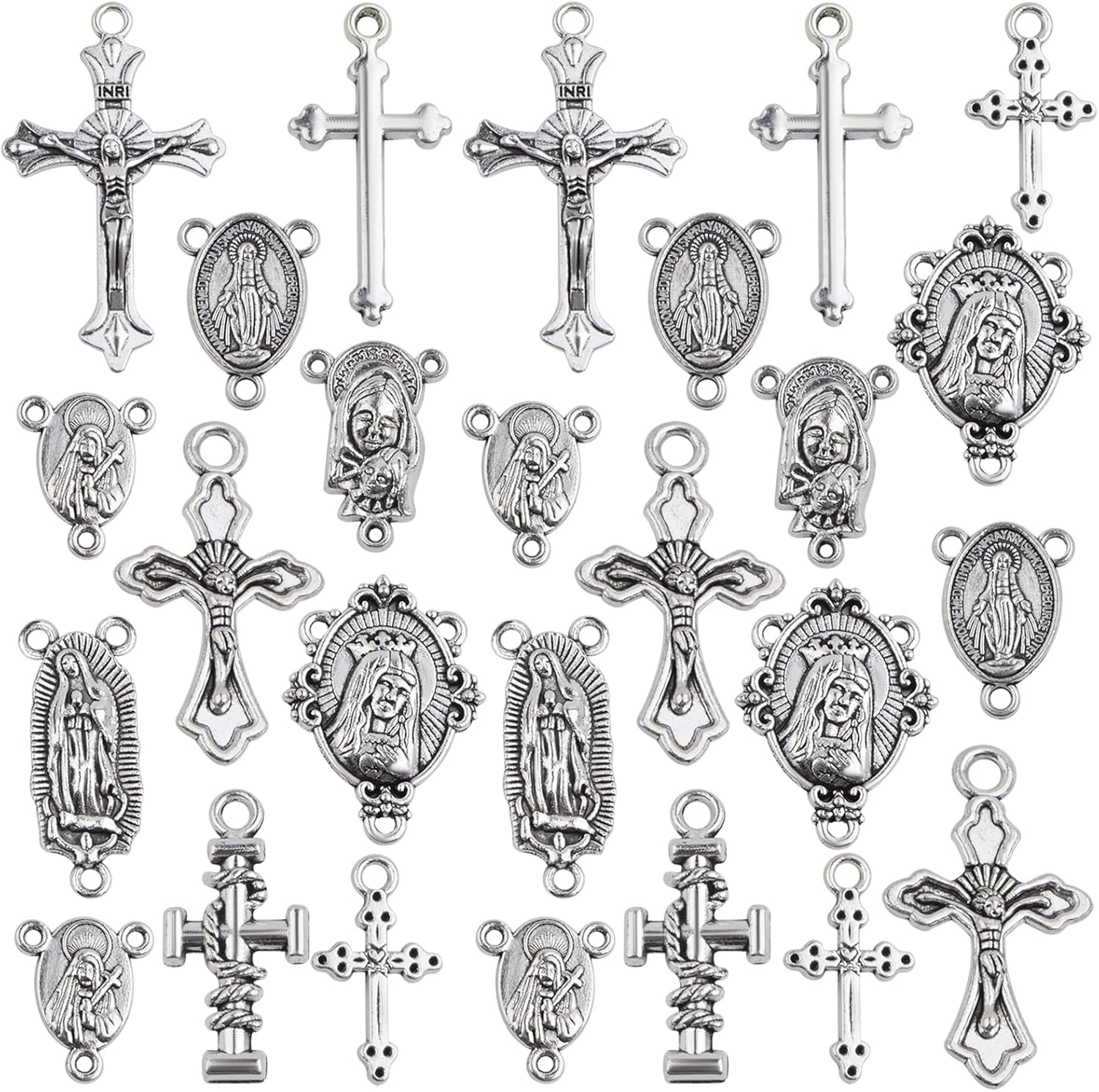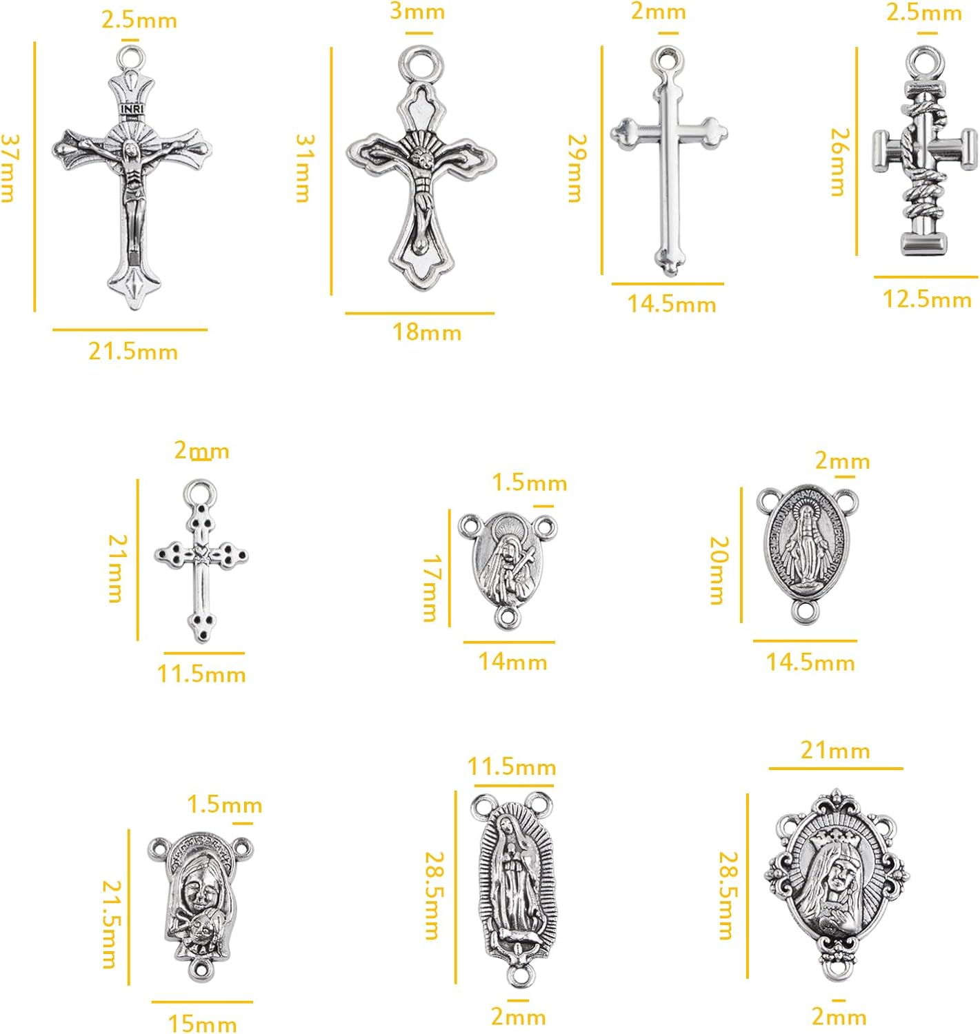 50pcs Rosary Cross and Center Miraculous Medal Charms Tibetan Jesus Crucifix Pendants Virgin Mary Oval Chandelier Links for DIY Rosary Necklace Jewelry Making, 10 Styles