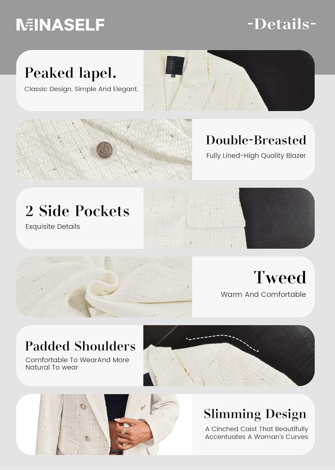 Mina Self 2025 Fall Women's Tweed Plaid Blazer Jacket - Fully Lined Fashion Business Casual Lapel Elegant Coat with Pockets