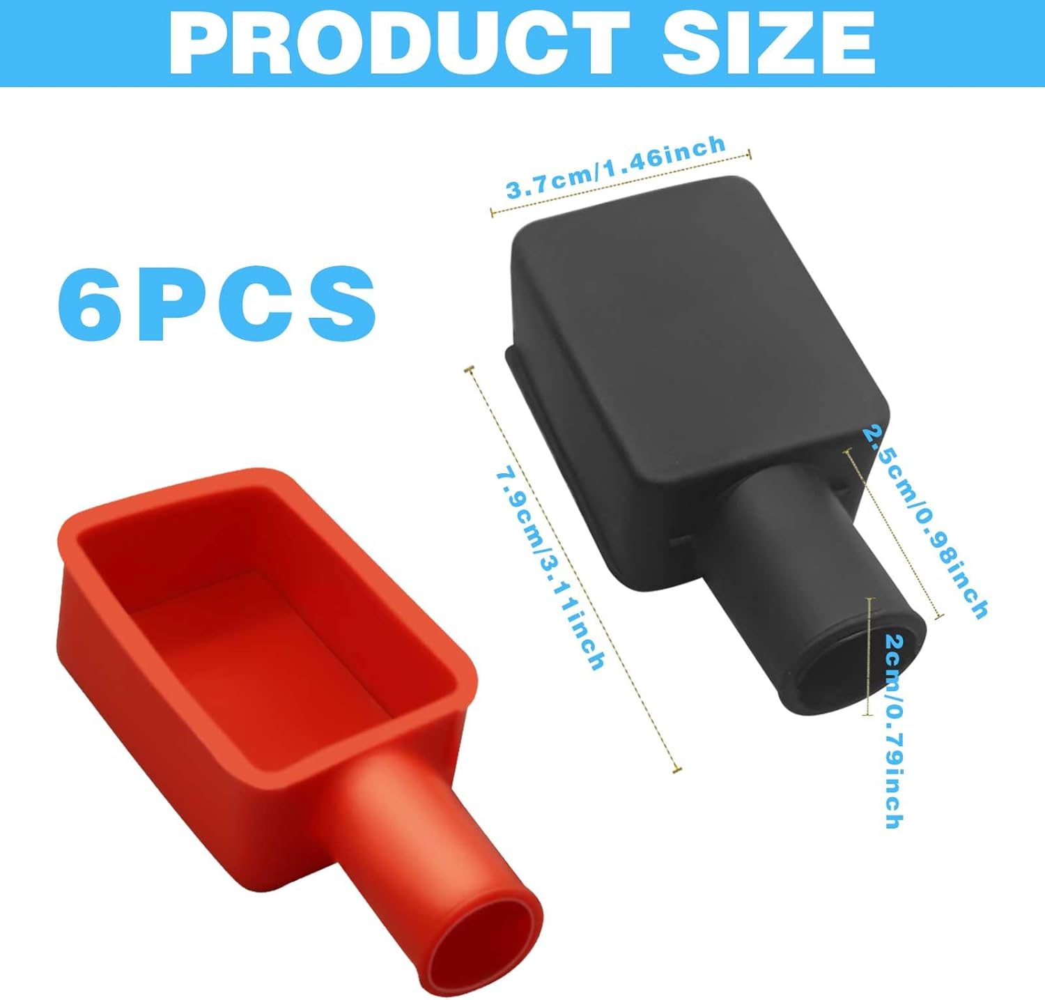 【Lo que Obtendrá】 El paquete contiene 6 piezas de cubierta de terminal de batería (negro/rojo), y el protector de terminal de batería mide aproximadamente 3.7x7.9 cm / 1.46x3.11 pulgadas. Si no está satisfecho con el producto que recibió, háganoslo saber y resolveremos el problema lo antes posible. (Nota: Por favor mida el tamaño antes de comprar.)