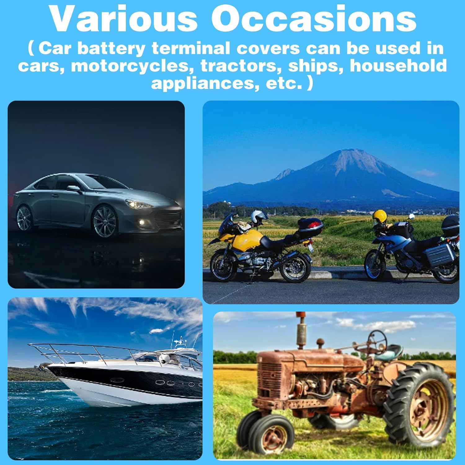 【Amplias Aplicaciones】 Estas cubiertas protectoras de batería son compatibles con la mayoría de los equipos eléctricos, como coches, motocicletas, camiones, RVs, barcos, tractores y otros equipos eléctricos. El diseño universal de la cubierta de batería del coche es adecuado para la mayoría de los terminales de batería estándar.