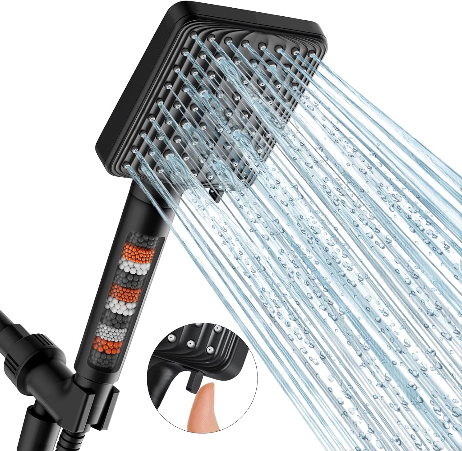 MakeFit Filtered Shower Head Black - 6 Modes High Pressure Handheld Shower Head with Filter Mineral Beads, Detachable Handheld Showerhead Set with Stainless Steel Hose and Shower Arm Bracket