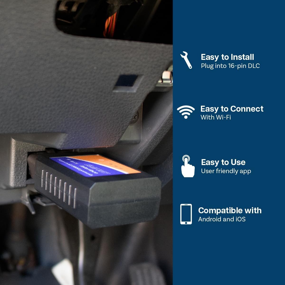 How to Use the Car Scanner – 1. Plug the device in your car's OBD2 port which typically is located under the dashboard - 2. Start the car - 3. Enable WiFi on your phone or tablet and connect with the scanner - 4. Run the app - 5. Search for "OBD2" and connect it with your device through the app (pin 1234 or 0000) - 6. Wait until it connects your car's ECU successfully – 7. Always take the scanner out of the port after you’re done. Leaving the scanner in the port can slowly drain your battery.