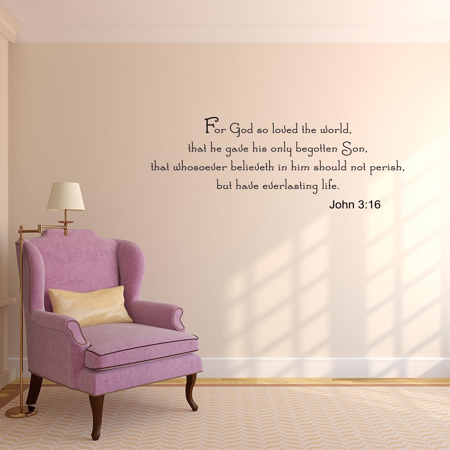 Our high quality inspirational vinyl decal "John 3:16" adhesive design comes in 15 inches by 42 inches. The pictures are for display and inspiration only. All of our vinyl wall decals are manufactured with premium industrial grade Lutema self-adhesive vinyls.