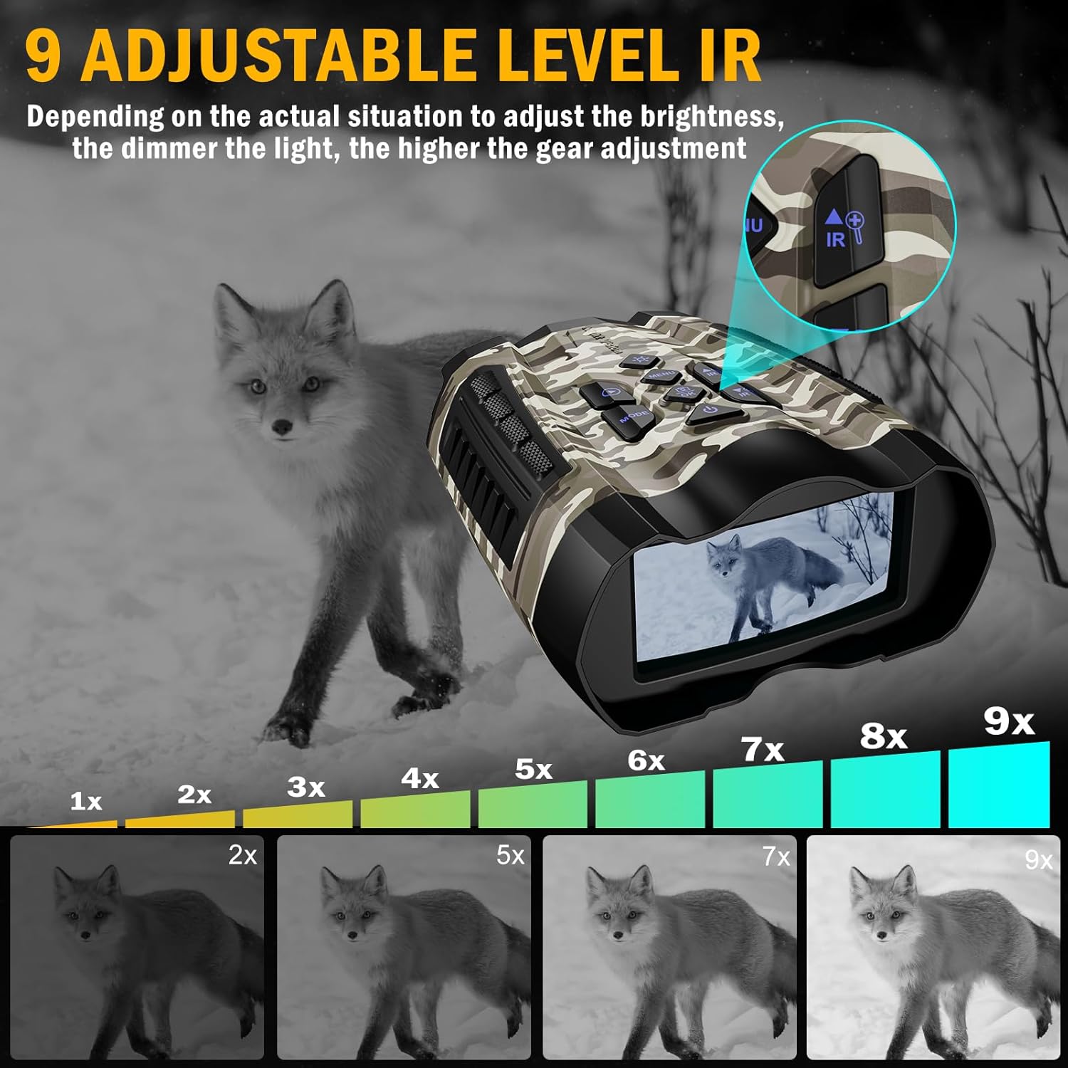 【3.5 Inch Screen and 10x Digital Zoom and 9 Levels IR】: The night vision binocular has an 10x digital zoom and a 50mm x 32mm objective lens, which enables you to view targets in the dark. It also comes with a 3.5-inch large screen, making it easier for you to observe your targets and discover more details. The 4K infrared night vision scope also features a 9-level adjustable infrared illuminator (850 nm) that can be adjusted according to needs