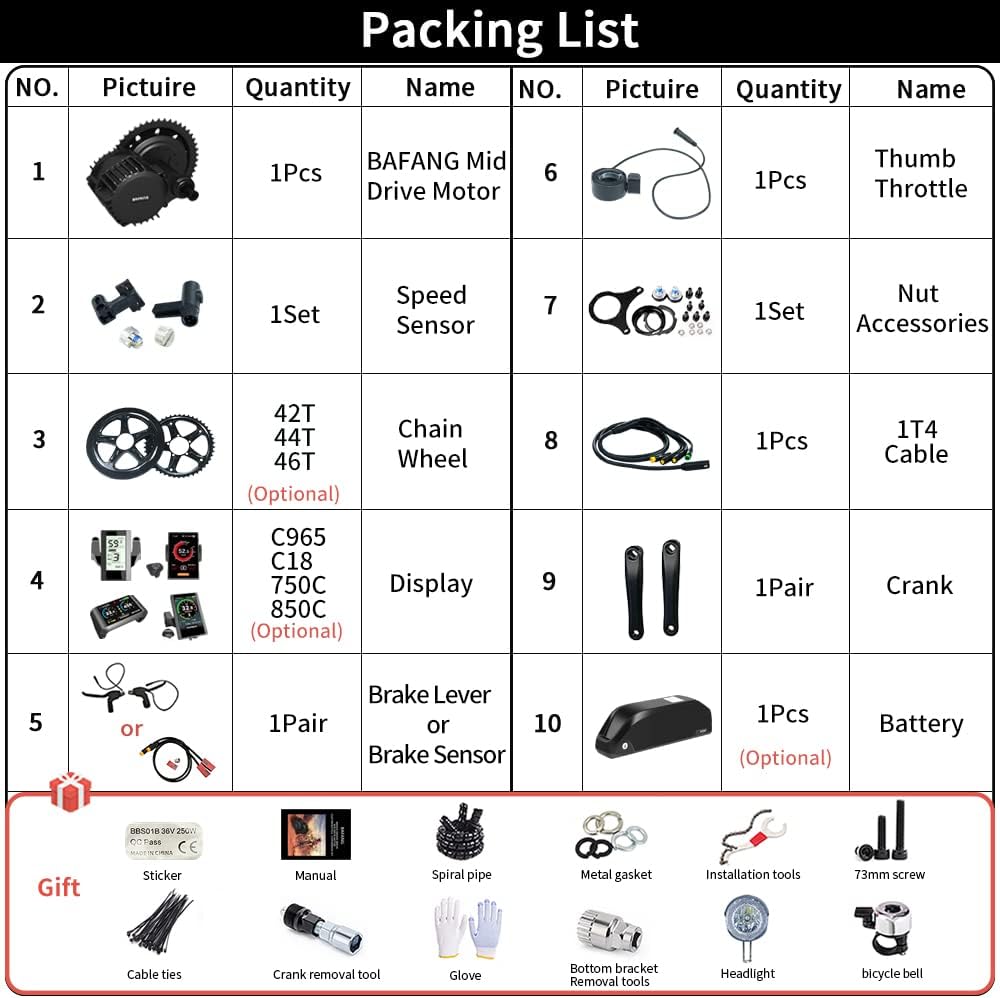 Full set of accessories:500W/750W/1000W mid-drive motor (48V or 52V), hydraulic brake or mechanical brake lever (any any), thumb throttle, sprocket, crank, display, speed sensor and magnet, 1T4 wire, nut. Gifts (headlights, wrenches, winding tubes, gloves, cable ties, bicycle pull tools, etc.) battery --- optional, batteries include: battery body, bottom bracket, charger, key.