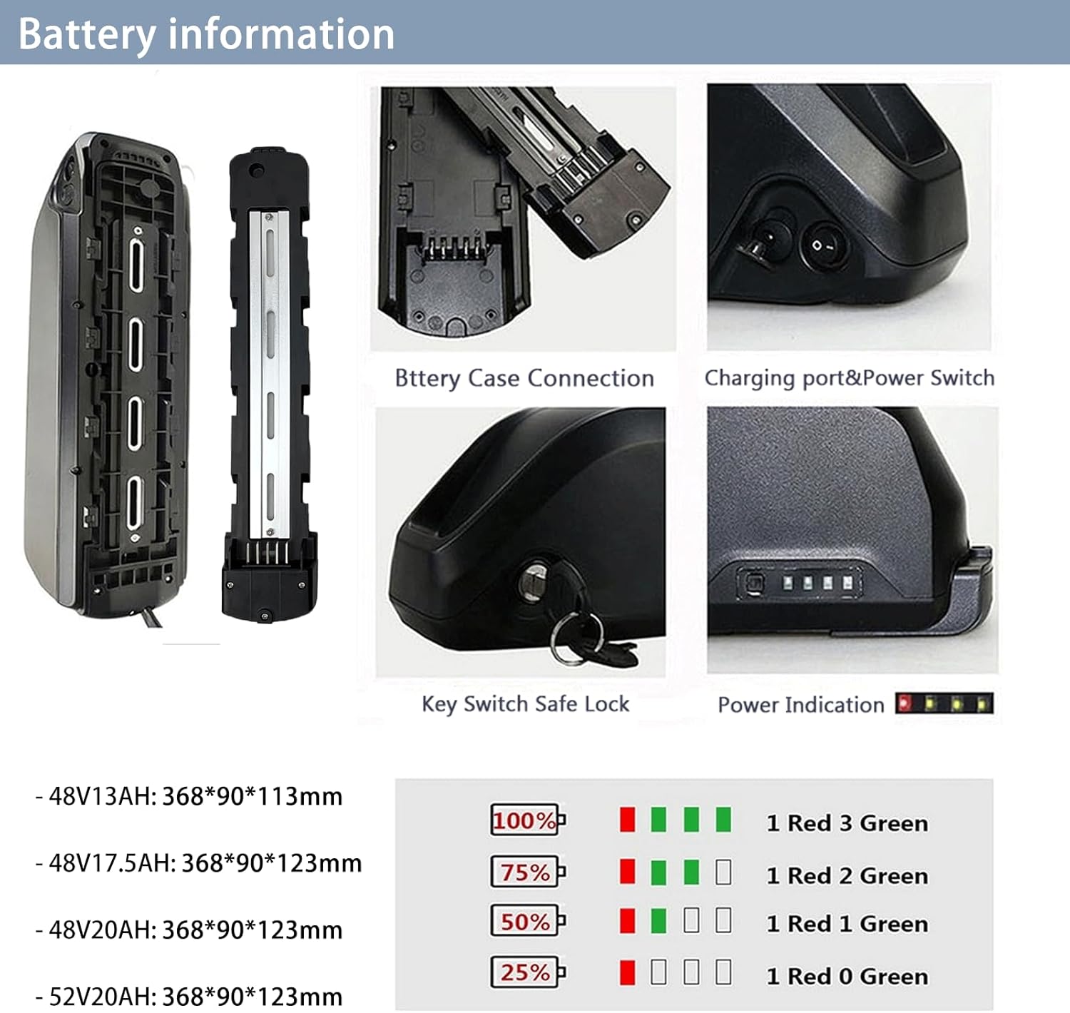 Note:Display specification: 850C/C18/750C BLE/C965;Battery specification: 48V13AH(368*90*113mm),48V17.5/20AH(368*90*123mm),52V20AH(368*90*123mm). Waterproof - All components and wiring are protected. If your special request is not received, the mechanical brake lever and brake sensor will be shipped randomly.