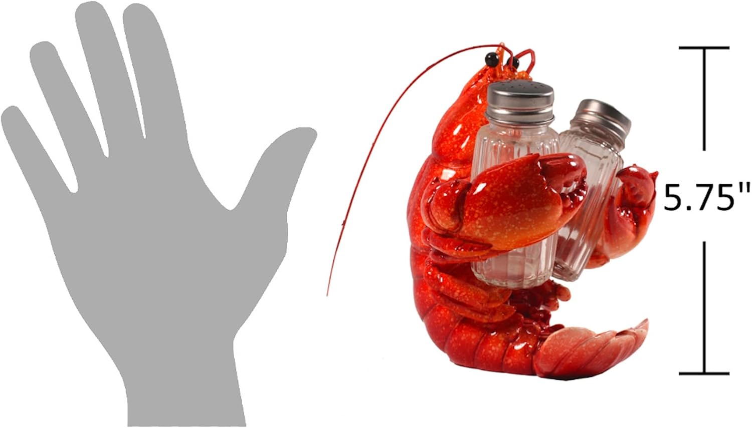 This sea side salt and pepper shakers set is the perfect accessory for your beach house decor! Crafted from polyresin in the shape of a sitting red lobster holding 2 glass salt and pepper shakers, this sturdy shaker set looks great on a kitchen counter, stove, or dining table. Both functional and stylish, this vibrant ocean salt and pepper set makes a great decor accent that fits with a variety of decorating styles: coastal, cottage, beach house, ocean, and more. The decorative lobster kitchen items measures 5.75"L x 4.5"W x 5.75"H and makes a great gift for Father's Day, housewarmings, birthdays, and more.