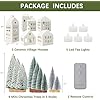 Package Includes - 5 Lighted white Christmas village houses, 9 mini Christmas trees and a remote control.