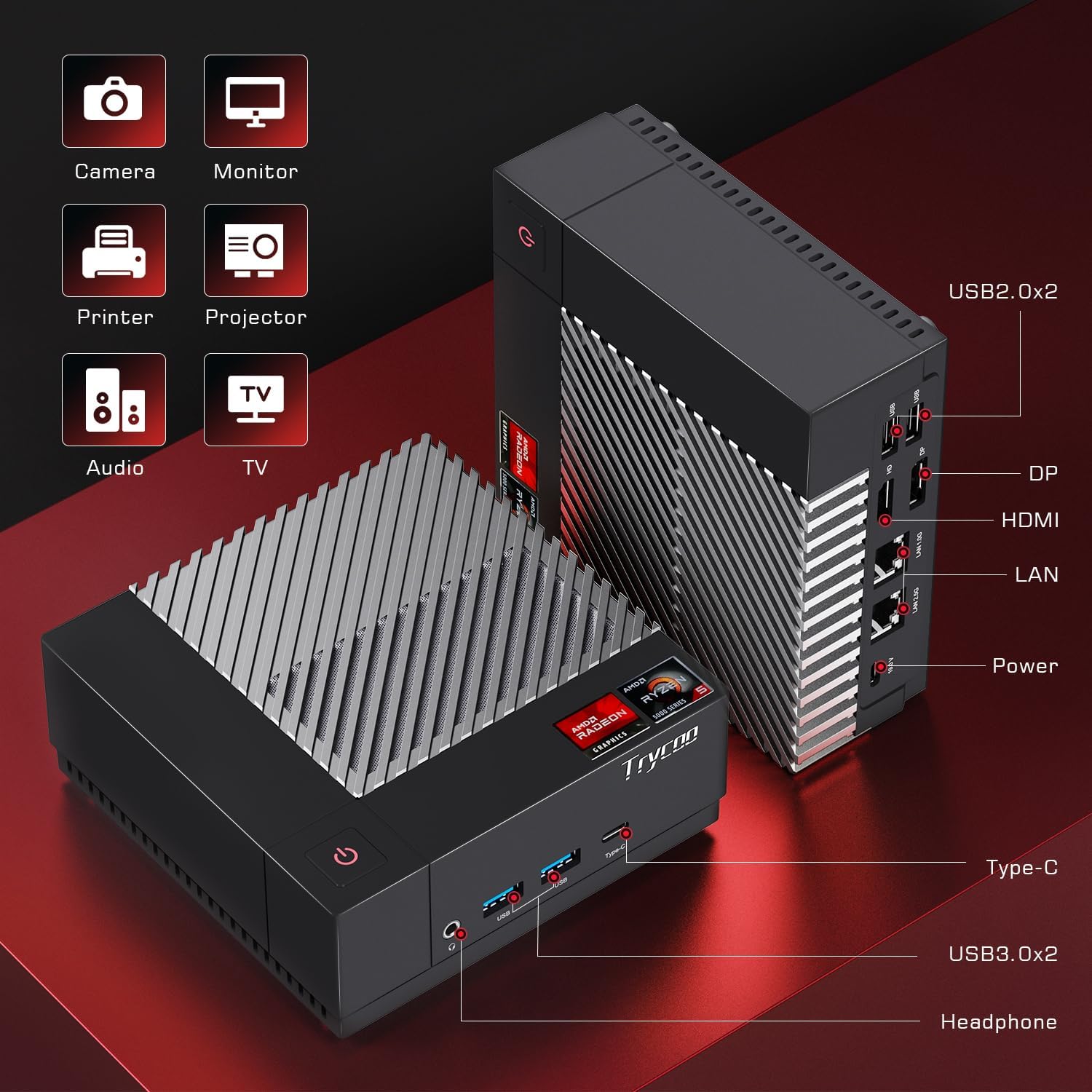 ✅【Multiple Ports,Various Choices】Trycoo HA-3 Mini PC have 1*HDMI Port,1*DP Port,2*USB 2.0 Port, 2*USB 3.2 Gen2 Ports,1*Type-C Port and other interfaces,plenty ports for connectivity simultaneous multi-program,balance your work and gaming needs.