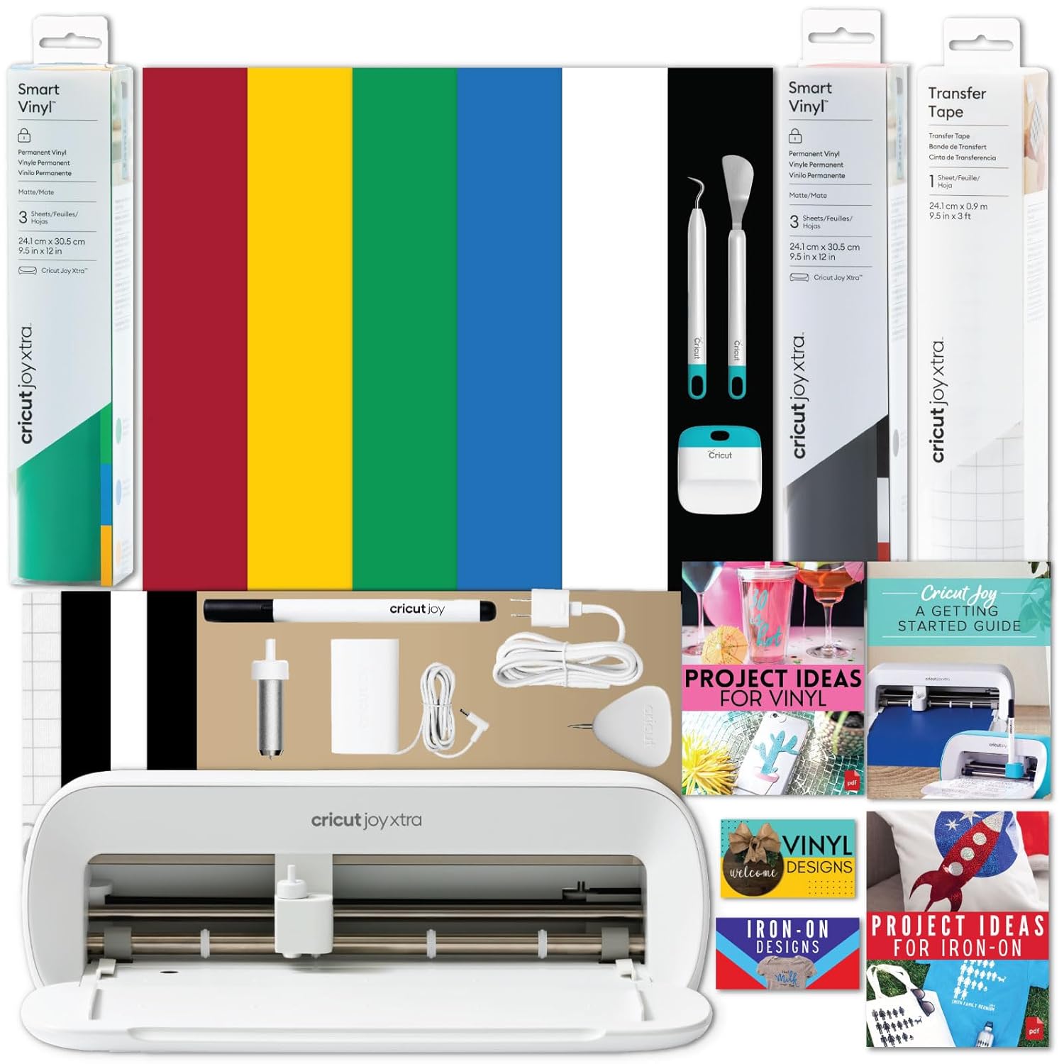 Bundle Includes: 1- Cricut Joy Xtra Machine, 2- Joy Xtra Smart Vinyl Sampler Rolls (each: 9.5 IN X12 IN (3)), 1- Joy Starter Tool Set, 1- Transfer Tape Roll, Joy Xtra Instructional Digital eBook Guide and SVG Designs (Print copy unavailable)