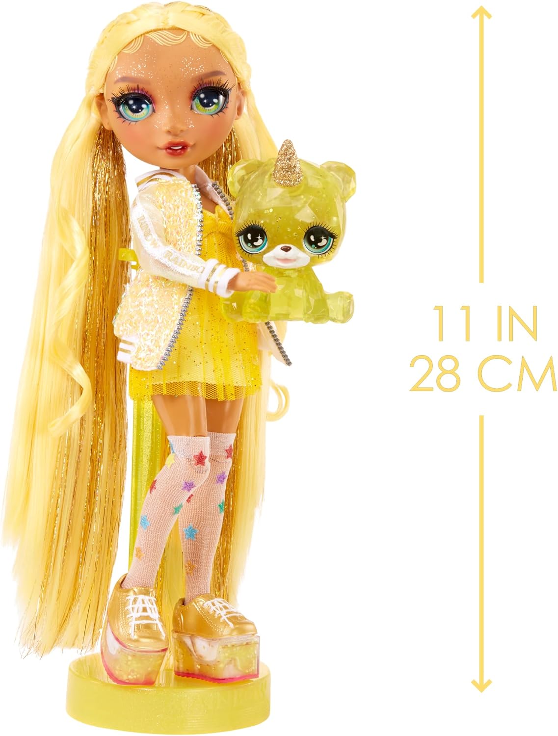 DESLUMBRE EN AMARILLO: Sunny está vestida en su característico COLOR AMARILLO de la cabeza a los pies con muchos brillos. Tiene hermosas y detalladas características en su moda, hermosas largas trenzas amarillas, largas pestañas y ojos de cristal. Y su rostro brilla con brillos mágicos.