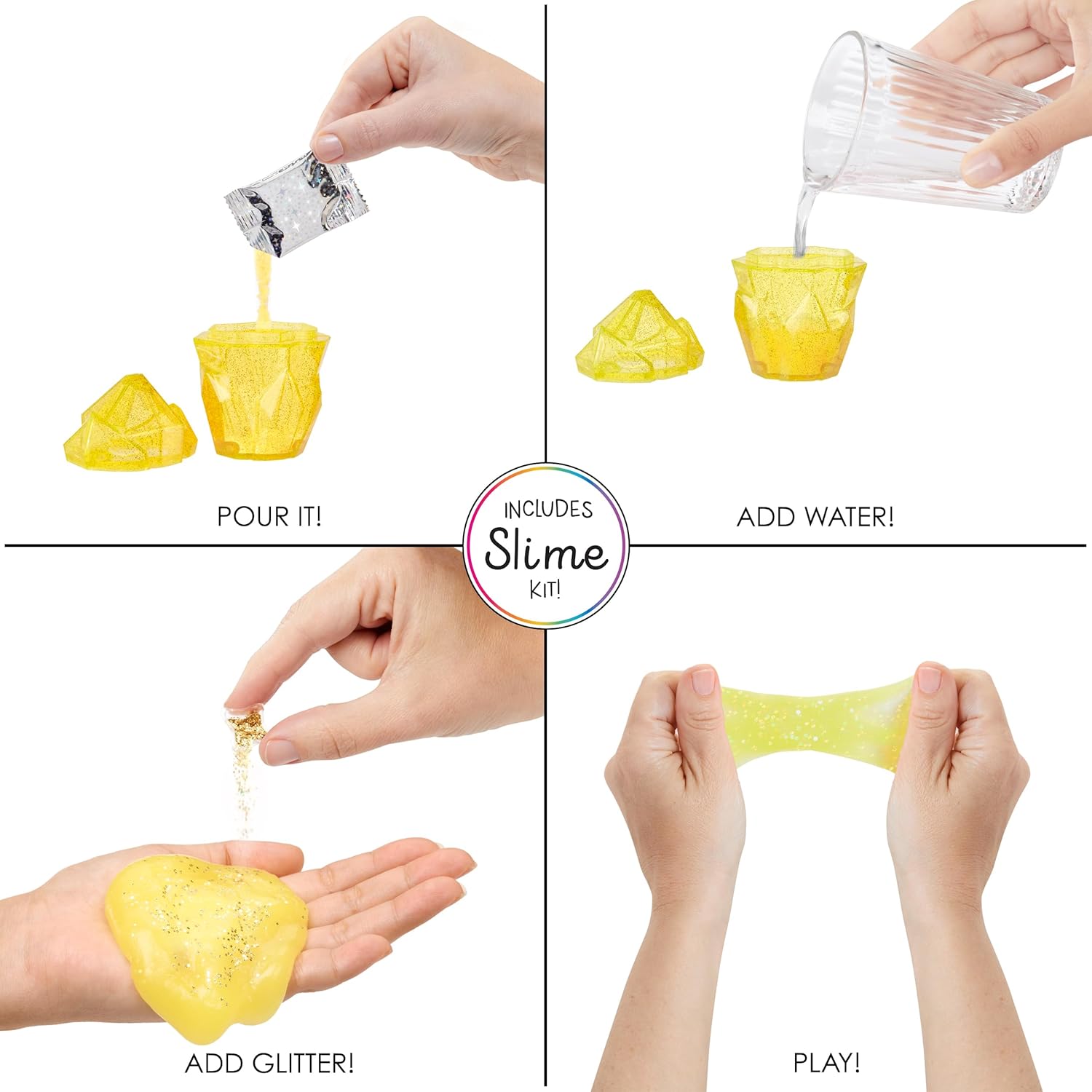 KIT DE SLIME BRILLANTE. Sunny Madison viene con todo lo que necesitas para hacer slime brillante DIY, incluyendo polvos de slime y de brillo y un sacacorchos de cristal para hacer y almacenar el slime. ¡Solo vierte el slime incoloro y los polvos de brillo en el cristal, agrega un poco de agua y sacúdelo para revelar un slime amarillo brillante! *Para hacer el mejor slime, asegúrate de seguir las instrucciones que vienen con la muñeca.