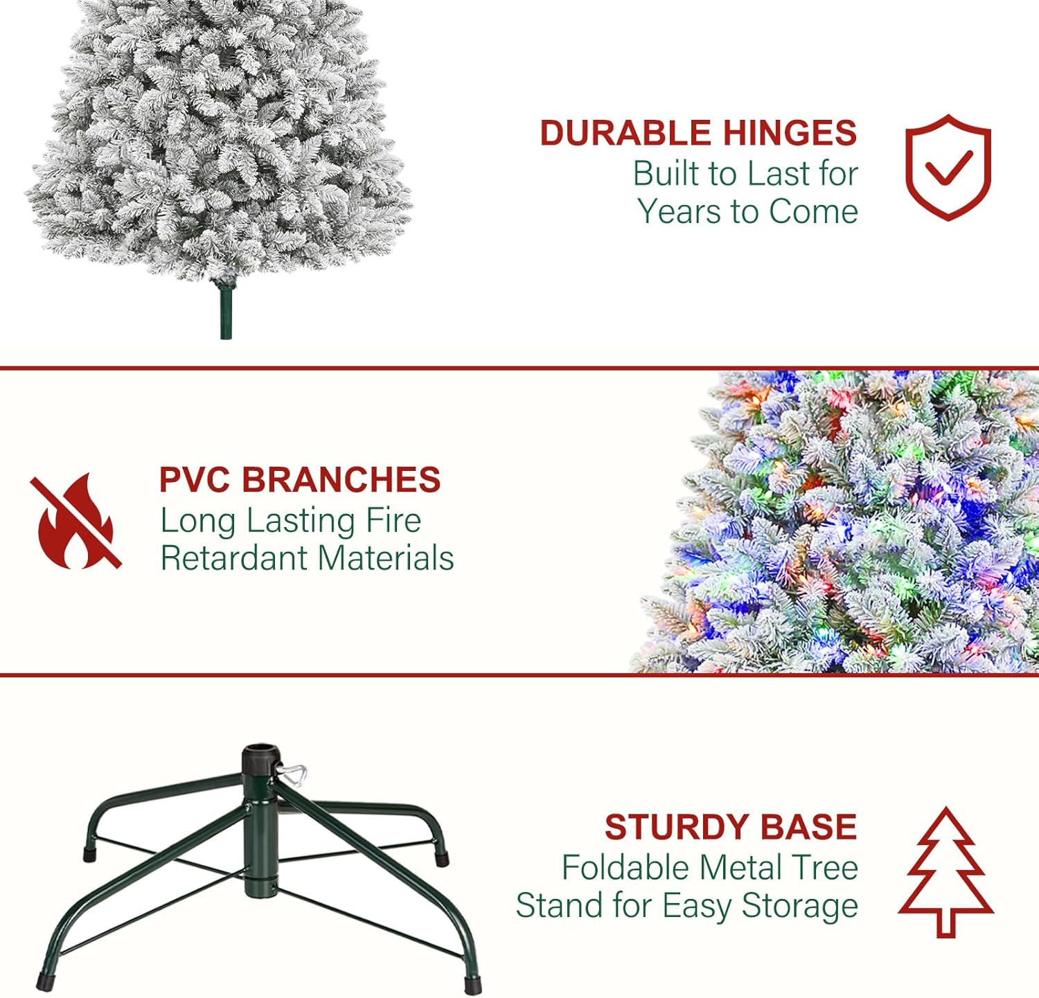 STURDY & DURABLE-This prelit Christmas tree is made with metal hinges, sturdy metal tree stand, flaming retarding PVC branches and UL Listed LED bulbs, which will bring joy and holiday spirit for years to come.