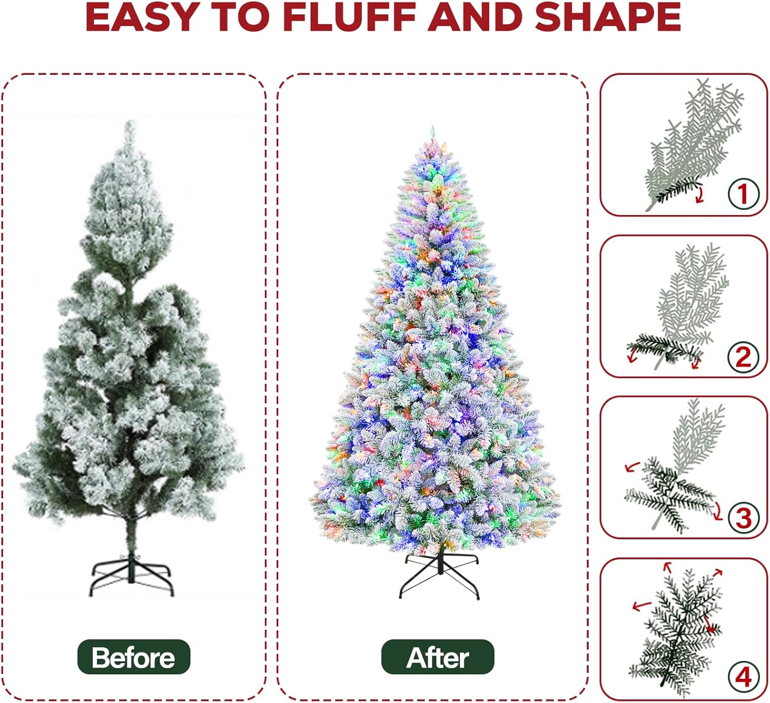 NATURAL APPEARENCE & Full LOOK-Measures 6 feet tall, 45 inches diameter at the base, the prelit Christmas tree features snow sprinkled branch tips, creates a wintry feel and 1032 branch tips for a full and life-like look, which can be easily fluffed and shaped for a splendid and natural display and also provides abundant space to showcase your favorite ornaments.