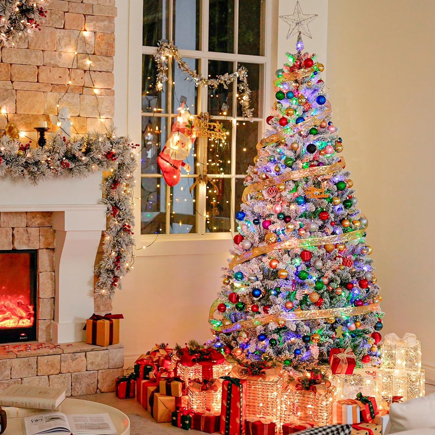 PRE-LIT CHRISTMAS TREE-The 6ft flocked Christmas tree add a mesmerized festive atmosphere to your home by changing 250 pre-strung lights from warm white to multicolor with the touch of a button. The bulbs are UL certificed, safely designed to remain lit even if one burns out. Included is a foot pedal switch to control 10 different light colors and actions.