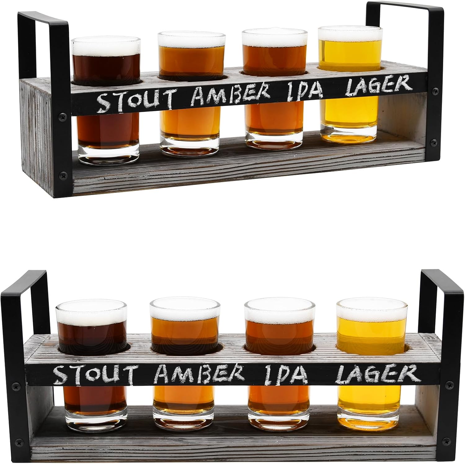 OwlGift Beer Flight Glasses and Board Set Included Torched Wood Serving Tray with Black Metal Handles and Chalkboard Panel and 4 Tasting Beer Glasses, Set of 2
